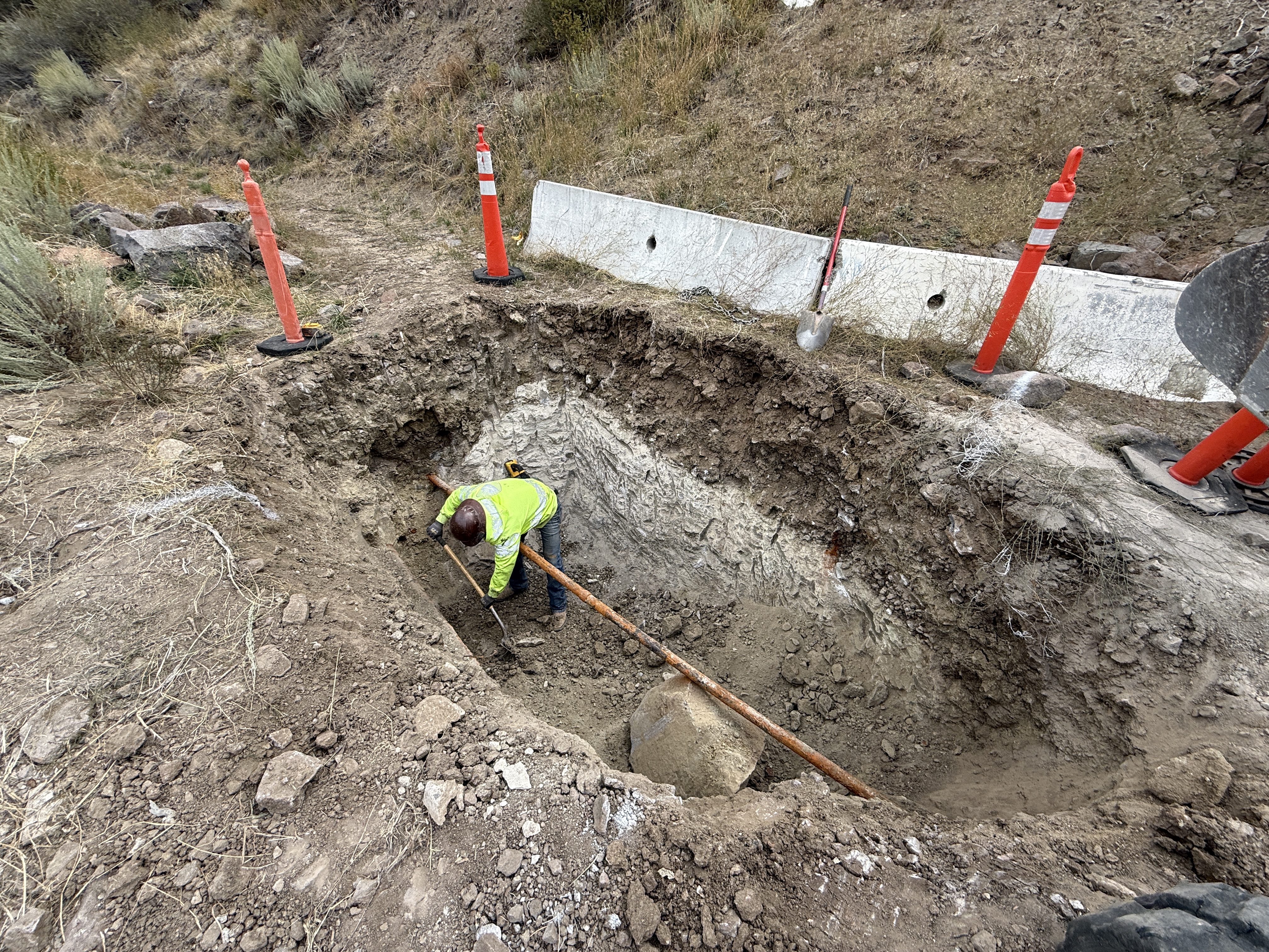 The image shows a single worker inside a large excavation pit wearing a hard hat and a hi-vis vest. The worker is using a long-handled tool, likely for digging or handling materials, adjacent to an exposed boulder. Several orange cones line the edge of the excavation along with a concrete barrier. There is a shovel placed near the top edge of the pit.