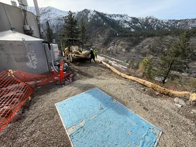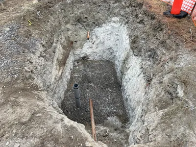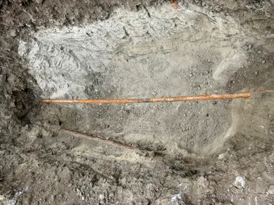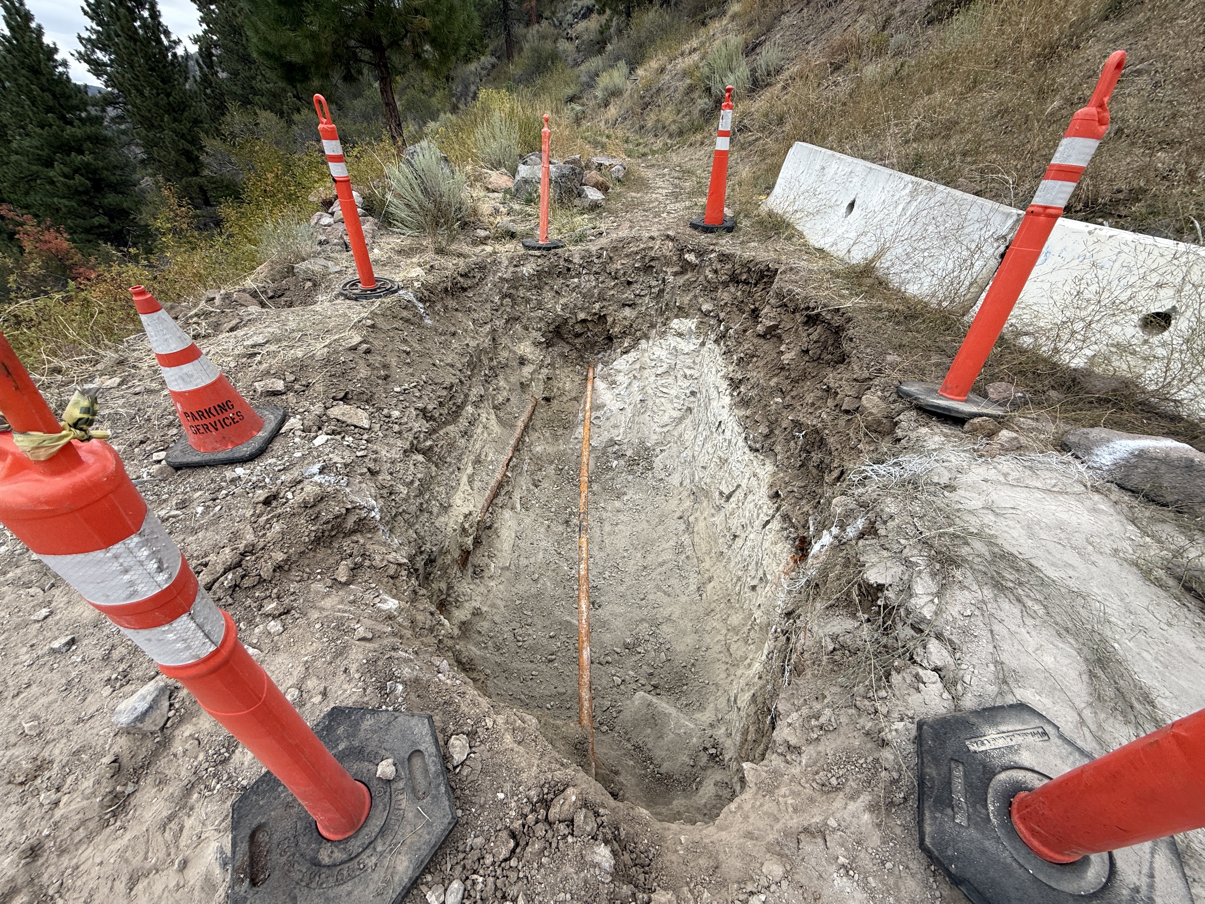 The image shows an open trench along a sloped area, bordered by several orange safety cones. There appear to be some wooden stakes or markers inside the trench. The surrounding area is natural terrain with some vegetation.