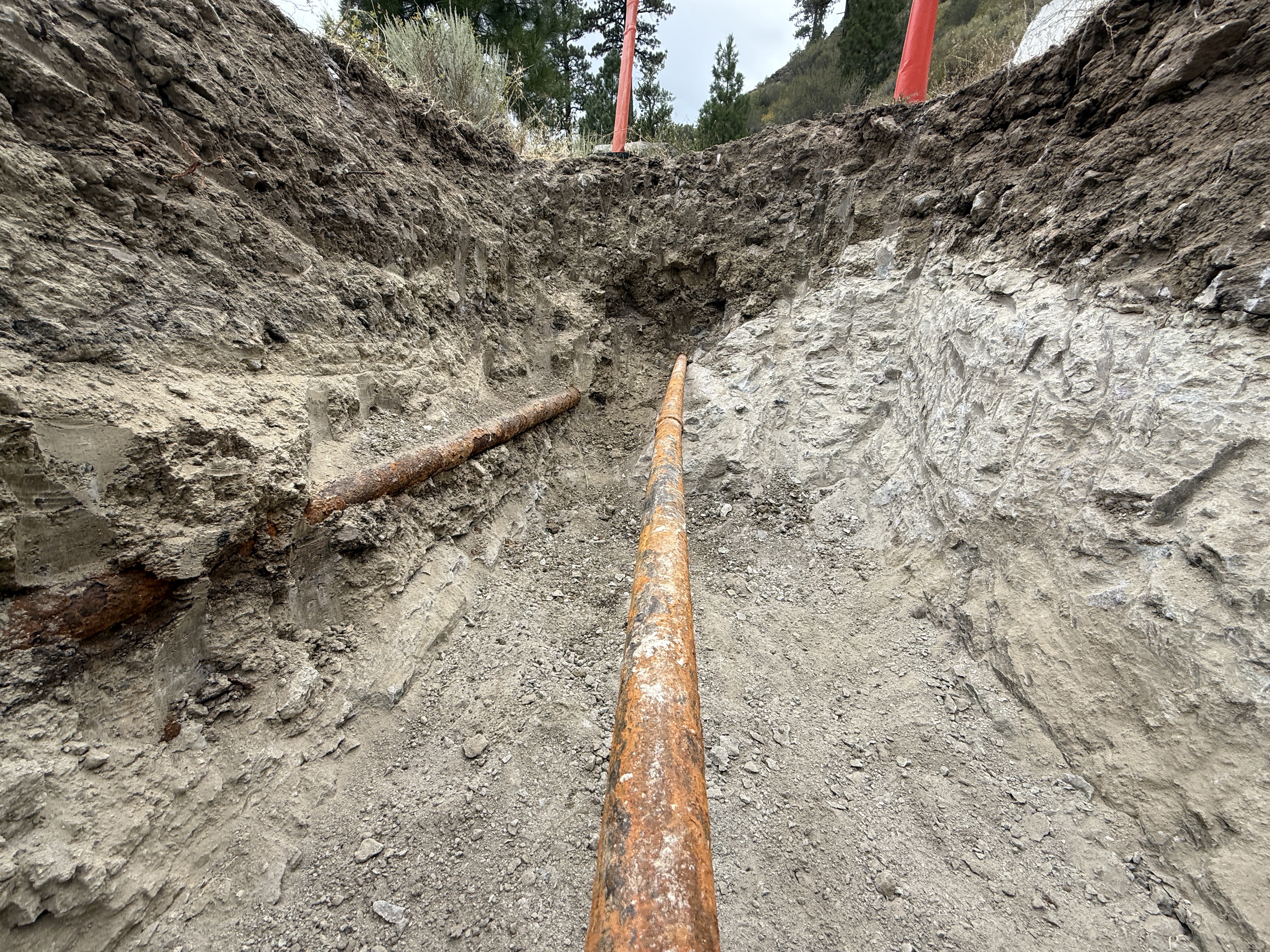 The image shows a trench with two rusted metal pipes exposed, running through it. The trench walls are composed of soil and some rock layers. Two red markers or posts are visible at the top, possibly indicating trench boundaries or caution. The trench appears to be part of ongoing excavation or trenching work for pipeline installation.