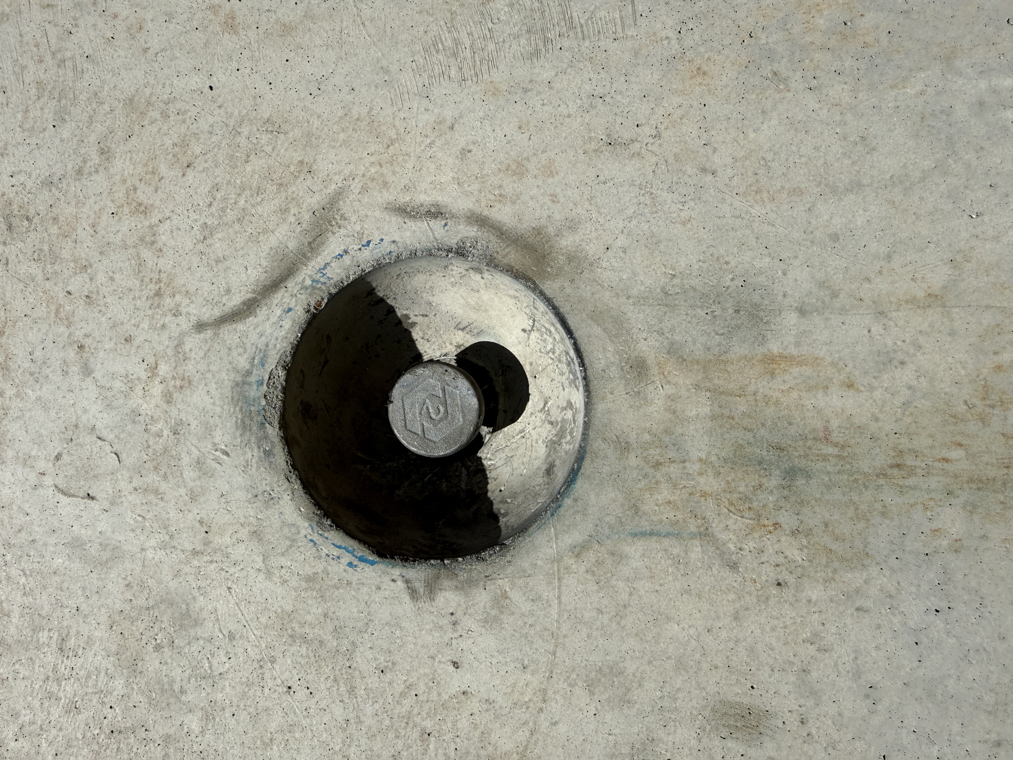 The image shows a concrete surface with a central recess containing a metal plug. The plug is fitted into a circular depression in the concrete, suggesting a potential anchoring or capping function. The surrounding concrete appears to be raw or unfinished, with some discoloration and surface marks visible.