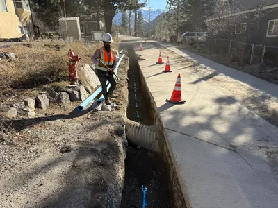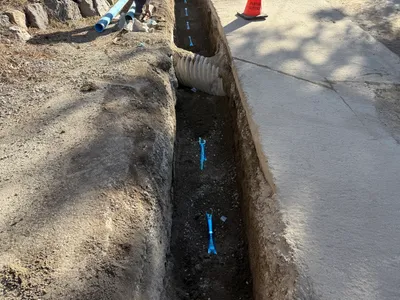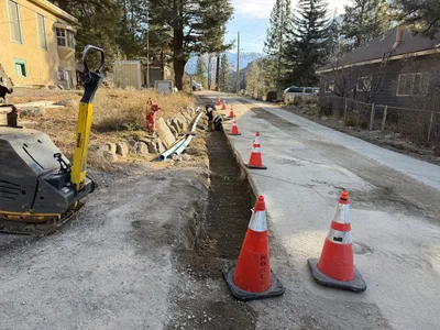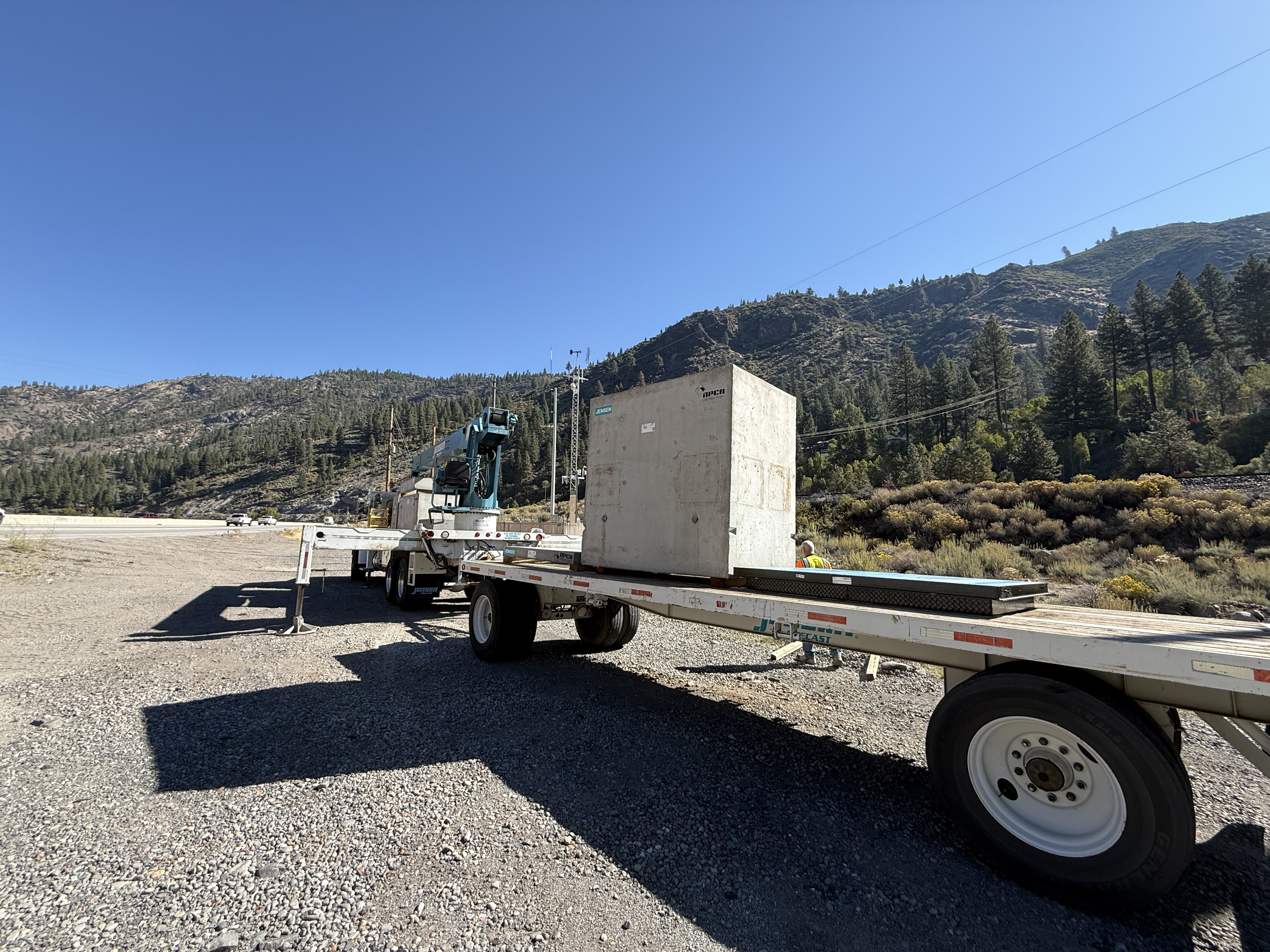 The image shows a flatbed trailer parked on a gravel surface with a large rectangular concrete block placed on it. There is a crane mounted on the trailer, suggesting preparation for loading or unloading. The site is located in a mountainous area, visible in the background with clear skies. A person wearing safety gear is present near the concrete block.