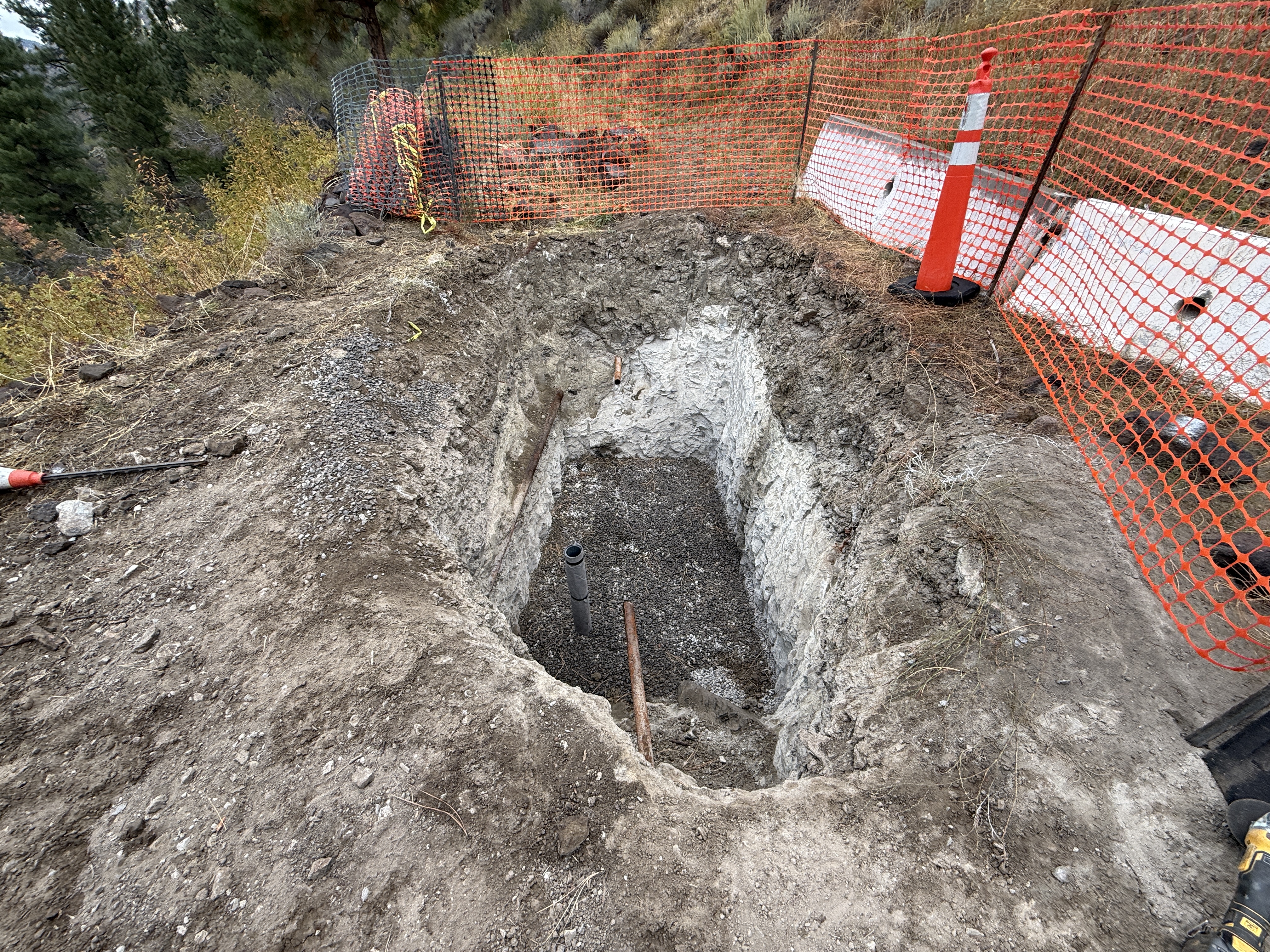 Safety features include an orange fence and a traffic cone around the open trench.