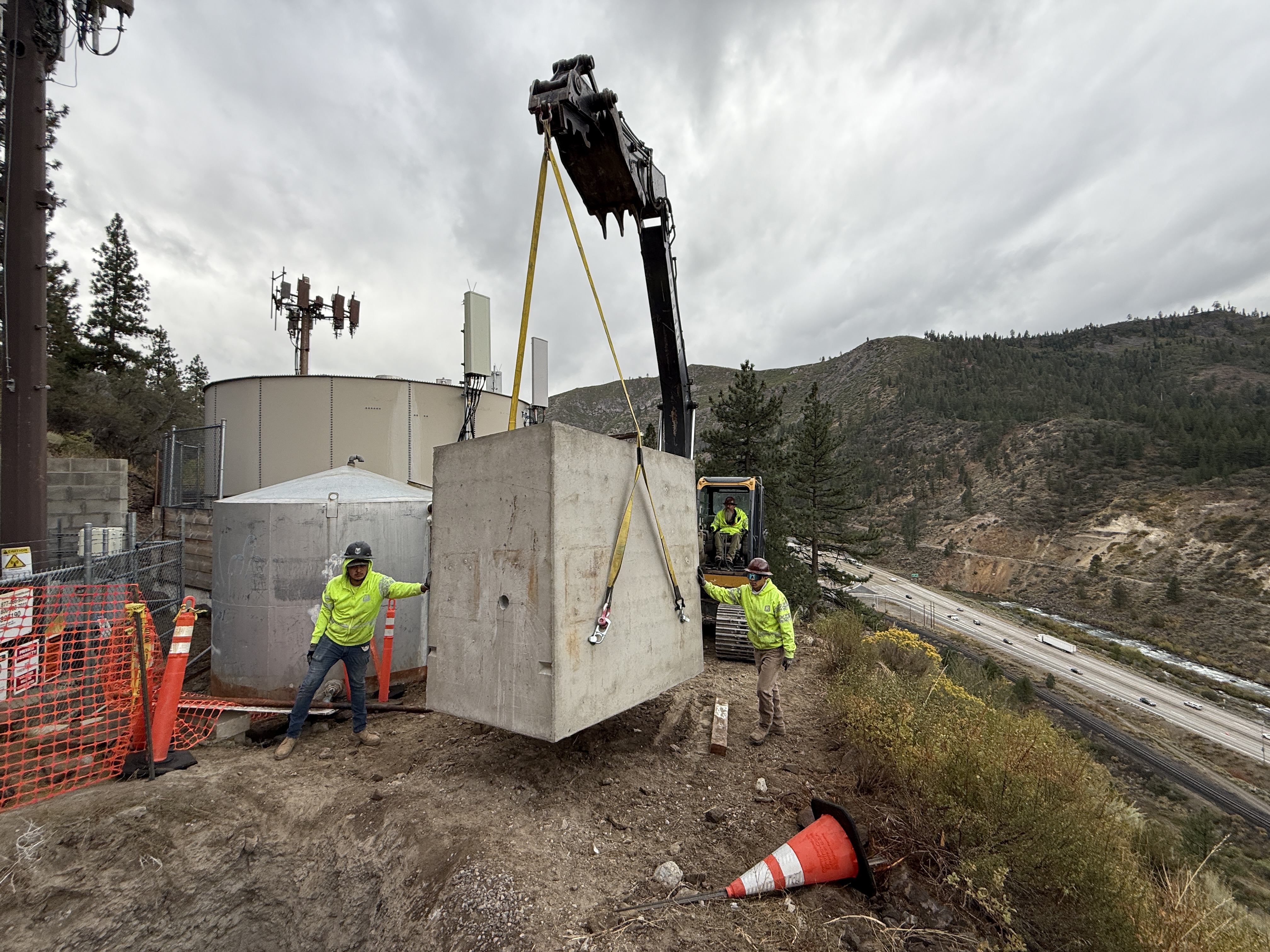 The image shows a crane hoisting a large concrete vault segment on a hillside, with two workers guiding it into position. The work area is near a cylindrical tank, with multiple safety cones and fencing visible. The setting appears to be a rural terrain overlooking a highway. Both workers are wearing high-visibility clothing and hard hats.