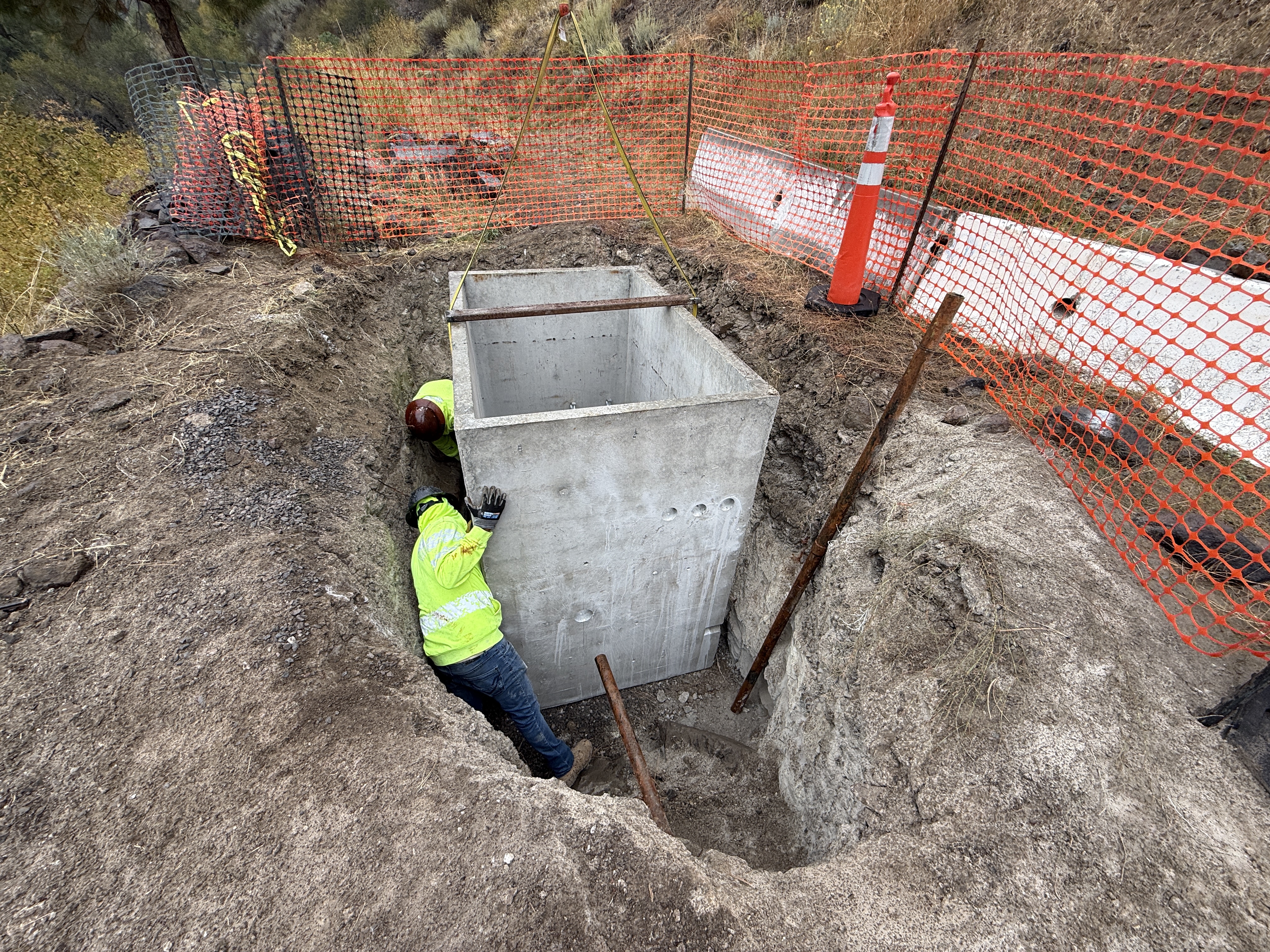 Two construction workers are positioning a concrete tank within a trench. The trench is lined with soil, and safety barriers and cones are present around the perimeter. Workers are wearing safety gear, indicating ongoing construction. The focus is on placing the concrete structure properly within the excavation area.