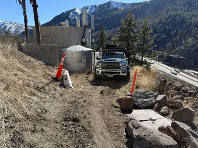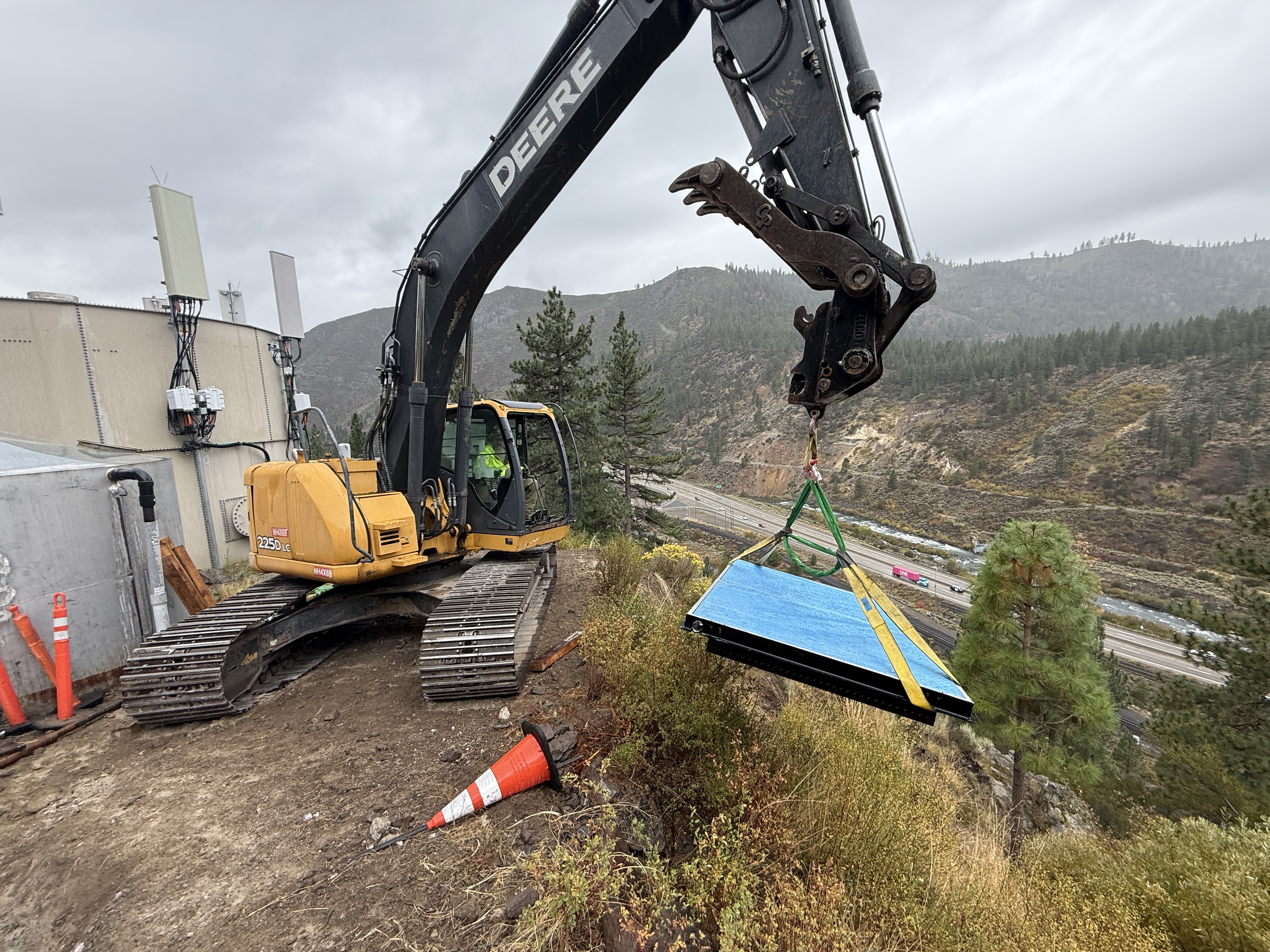 The image shows an excavator positioned on rough terrain near a raw water tank. The excavator's arm is holding a blue load secured with green and yellow straps. Surrounding the area are construction materials and equipment, and the landscape shows a highway in the background with overcast weather conditions.
