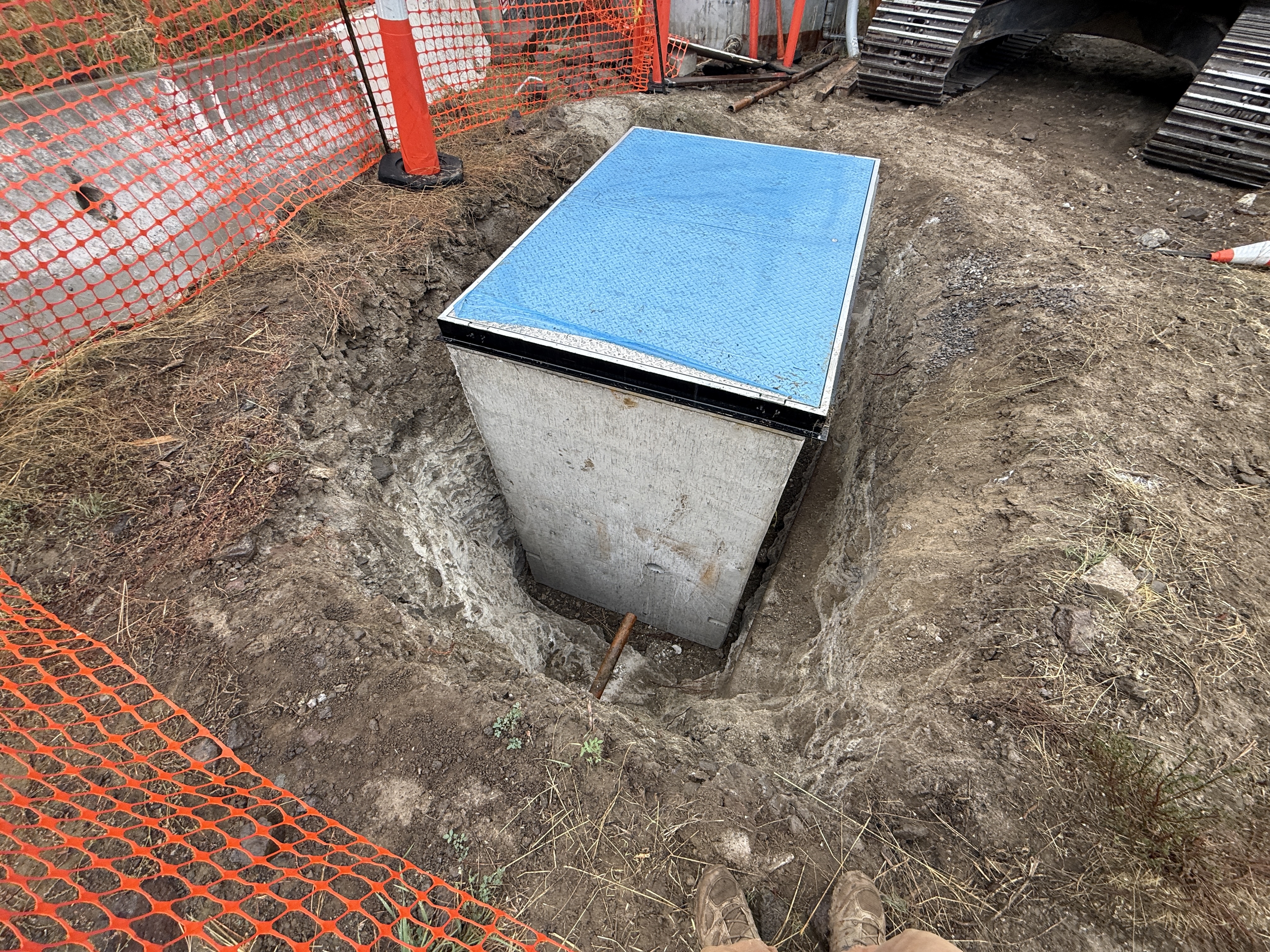 The image displays a partially buried rectangular concrete tank inside an excavation area with visible trench walls around it. A blue cover is on top of the structure, and a trench box is not visible. An orange plastic safety fence surrounds the area, and there is heavy equipment visible in the background. The ground appears uneven with exposed soil.