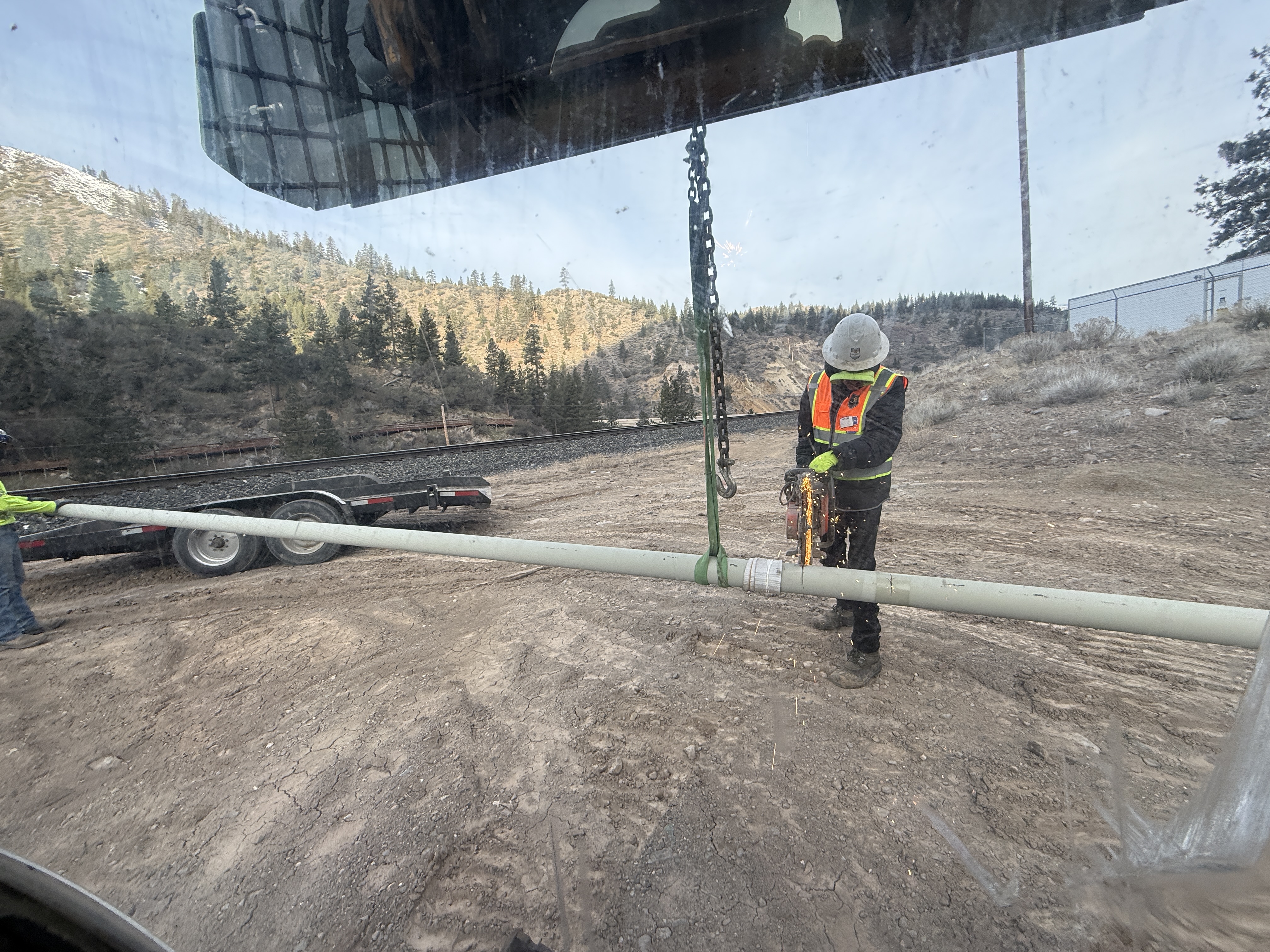 A worker wearing safety gear is using a tool to cut a pipe suspended by chains in an outdoor area. The activity is taking place on uneven ground, with a trailer visible in the background. The worker is wearing a hard hat and high-visibility vest. Vegetation and hills form the backdrop of the setting.