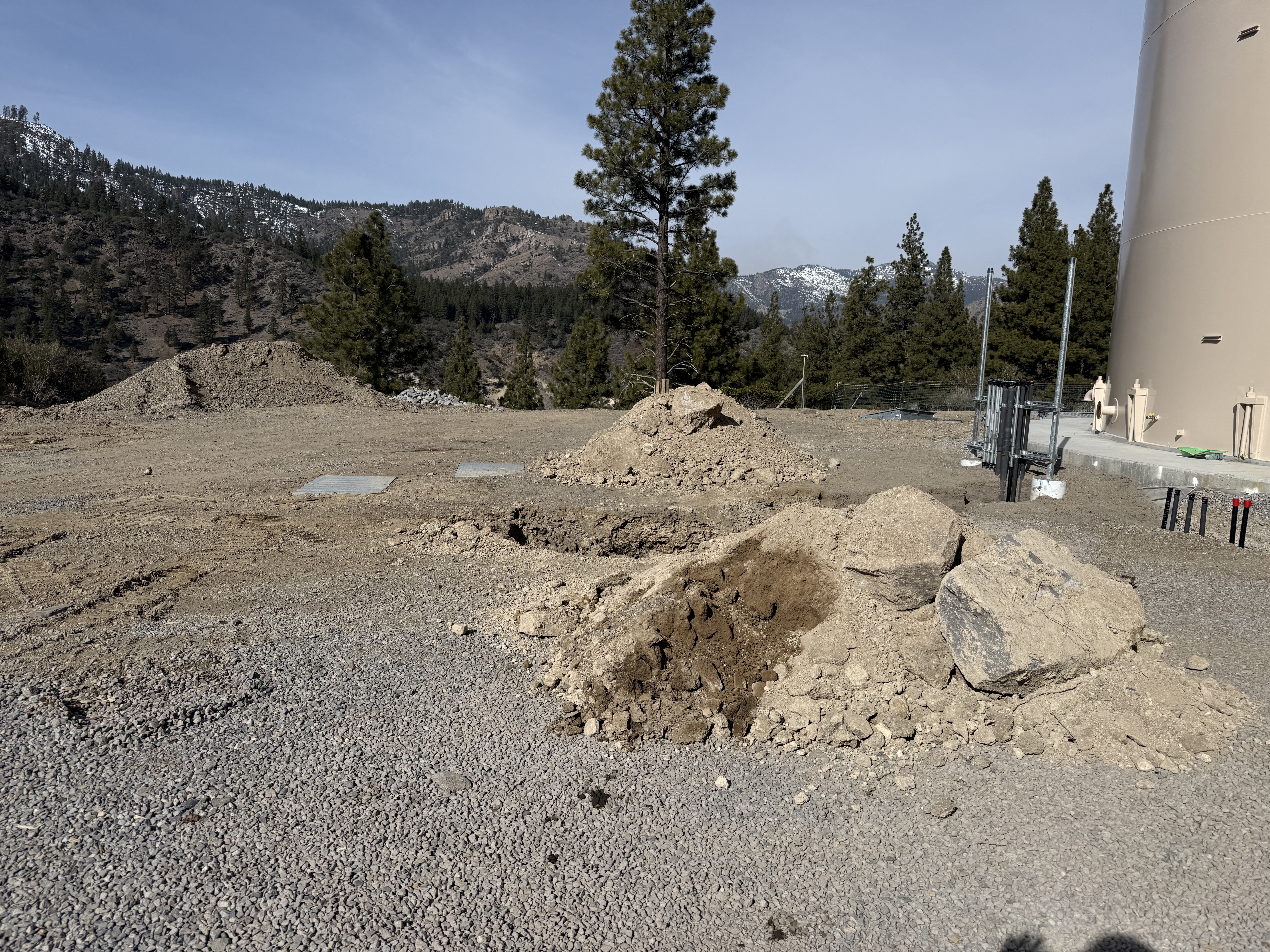 The image shows an area with excavation work ongoing, with multiple piles of dirt and rocks present. The right side shows a cylindrical structure with pipes and conduits attached. In the background, there are mountainous and forested areas. It is unclear what exactly is being installed or the specific phase of construction.
