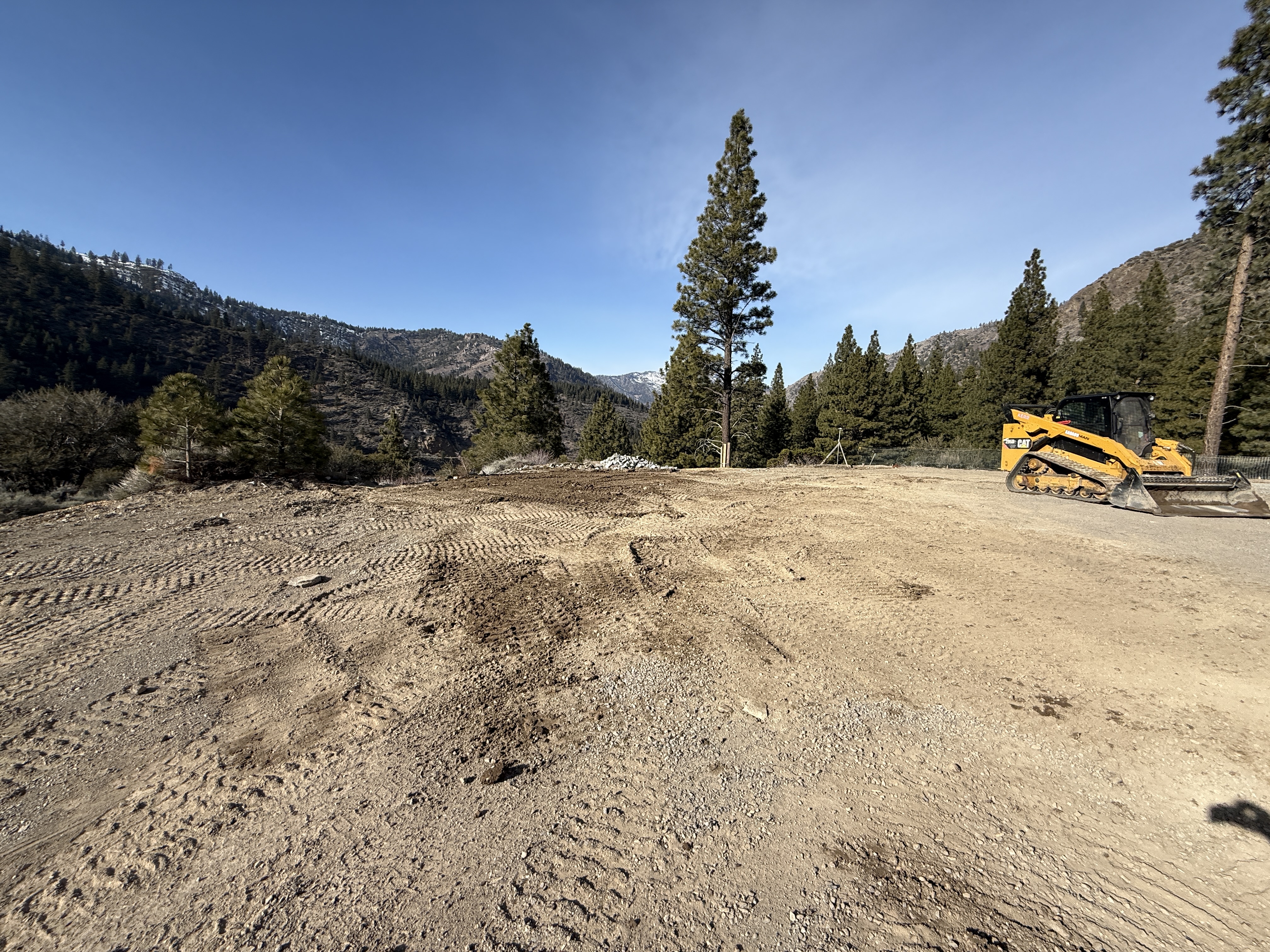 The image captures a construction site in a forested area with a focus on site-grading activities. A yellow tracked loader is positioned on the right side of the image, with its bucket facing inward. The ground shows tire marks and is visibly disturbed, indicating recent grading or leveling activity.