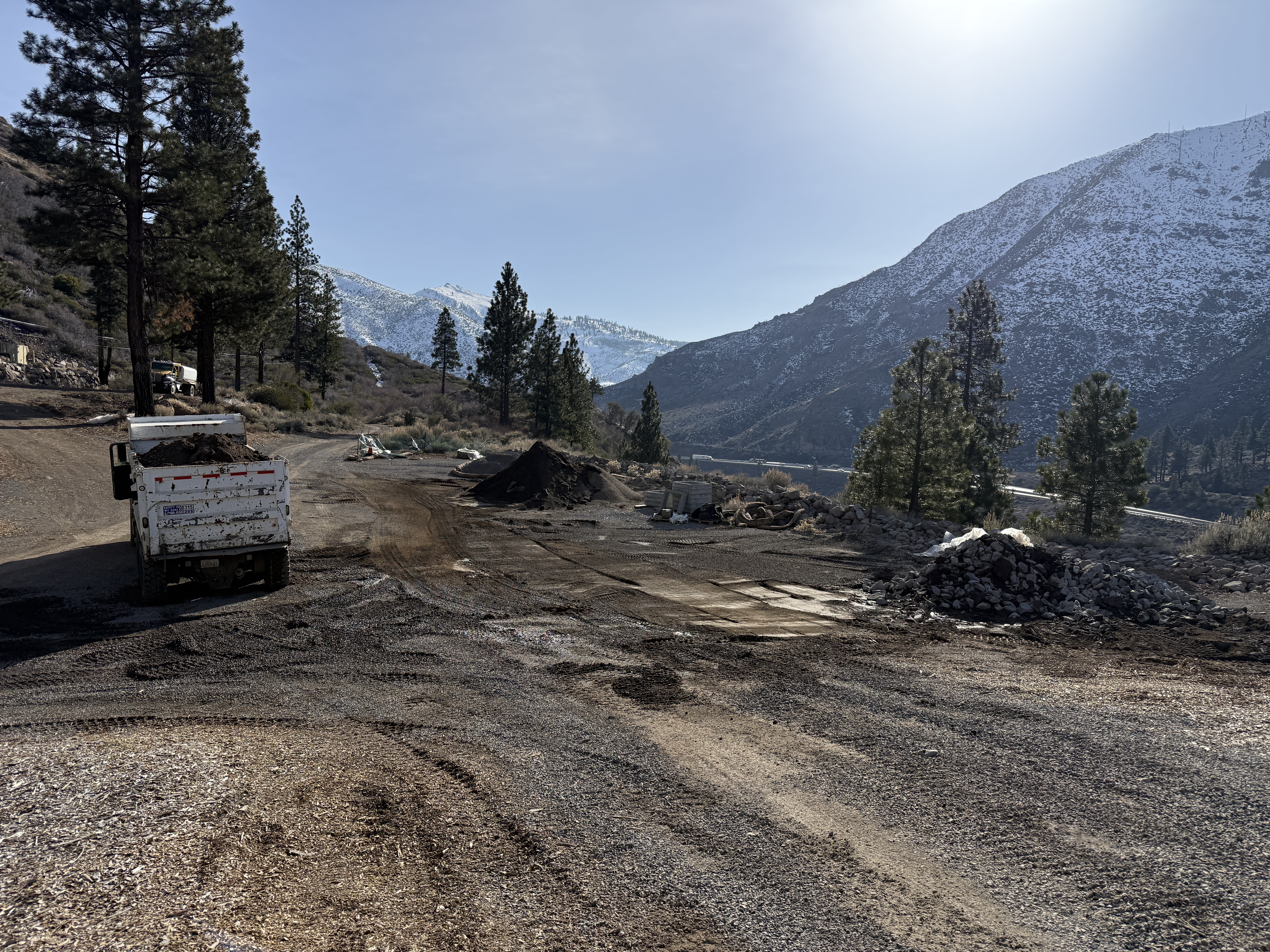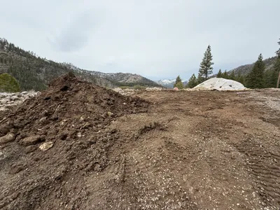 The image shows a dump truck positioned on a dirt surface, with its bed partially loaded with soil and gravel. Several piles of dirt and gravel are arranged on the ground nearby. The scene is set against a backdrop of snow-covered mountains and trees. No active work is observed, and the area appears to be set up for material handling and staging.