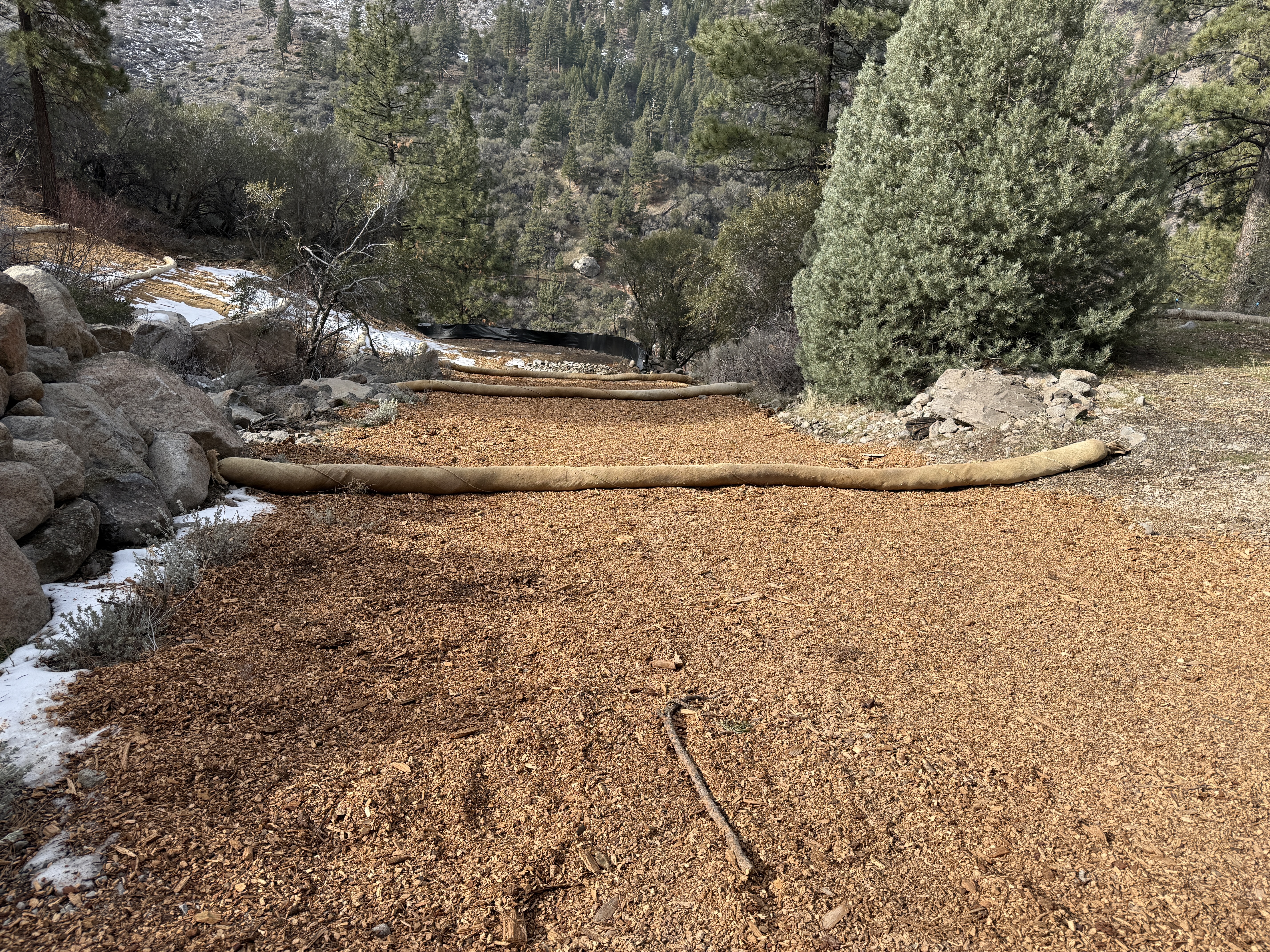 The image shows a series of erosion control wattles laid perpendicular across a mulched path or embankment area, likely aiming to manage water flow and minimize soil erosion. The wattles are positioned at regular intervals along the path, with rocky terrain and trees visible in the background. Mulch covers the path, providing ground stabilization.