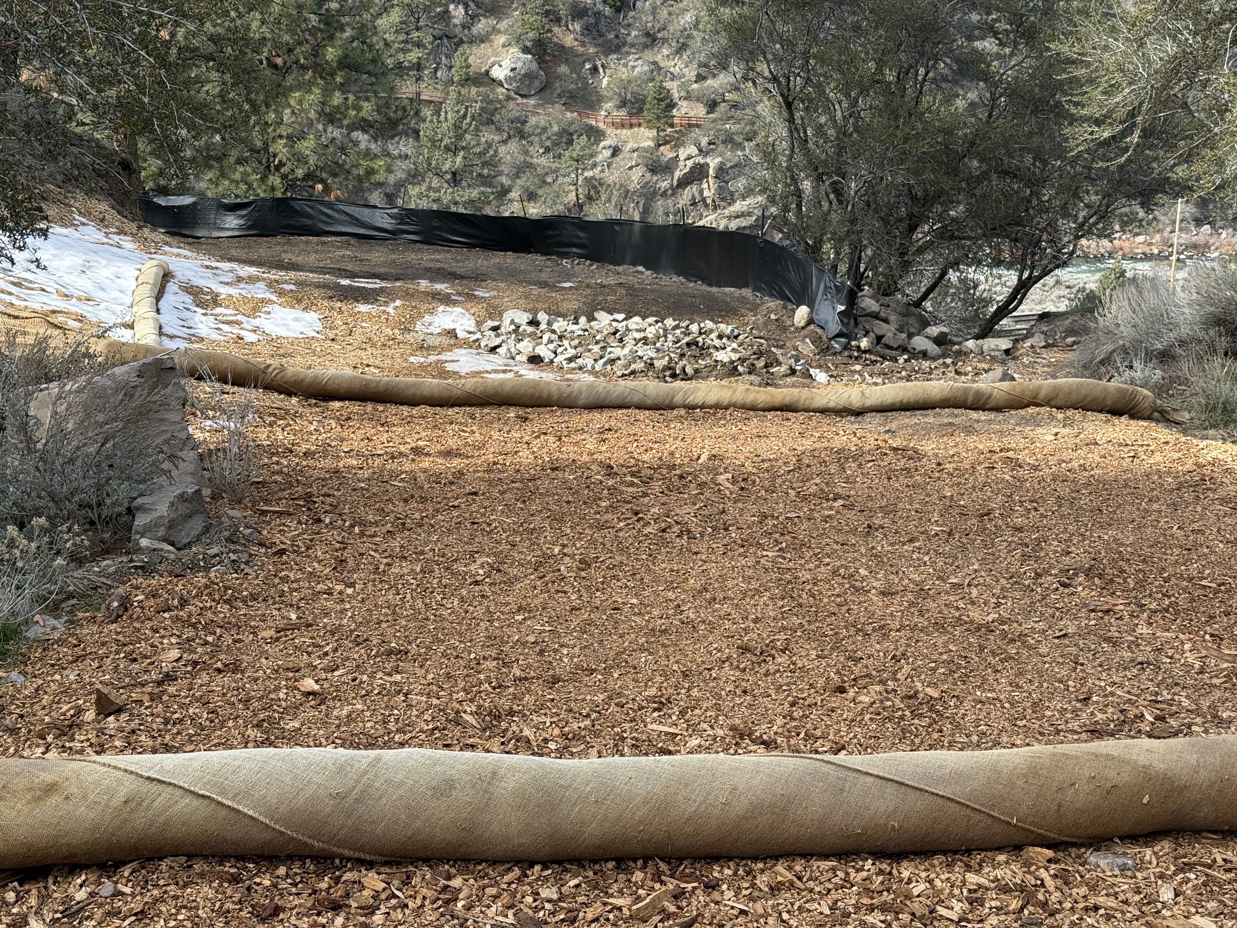 The image shows an area with erosion control measures including wattles laid out in parallel lines and a black silt fence in the background. The ground is covered with wood chips and there is some snow visible on the edge. Rocks are piled near the silt fence for additional stabilization or drainage control.