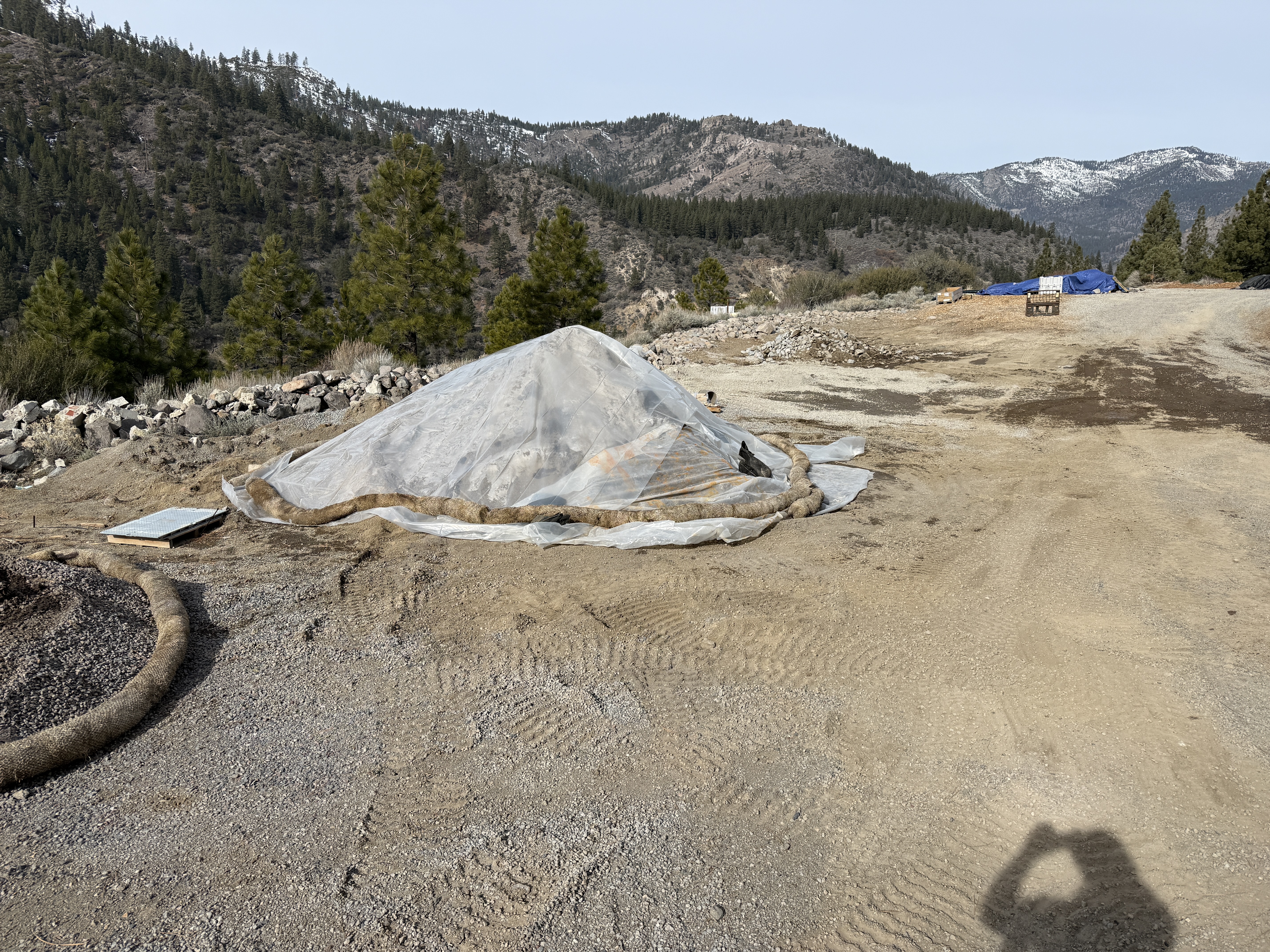 The image shows a mound covered with a tarp, surrounded by erosion control wattles on a construction site in a mountainous area. Gravel and dirt are visible on the ground, suggesting recent site preparation or maintenance. The surrounding landscape features trees and distant hills with some snow. A shadow indicates it's sunny, but there are no visible workers or active machinery.