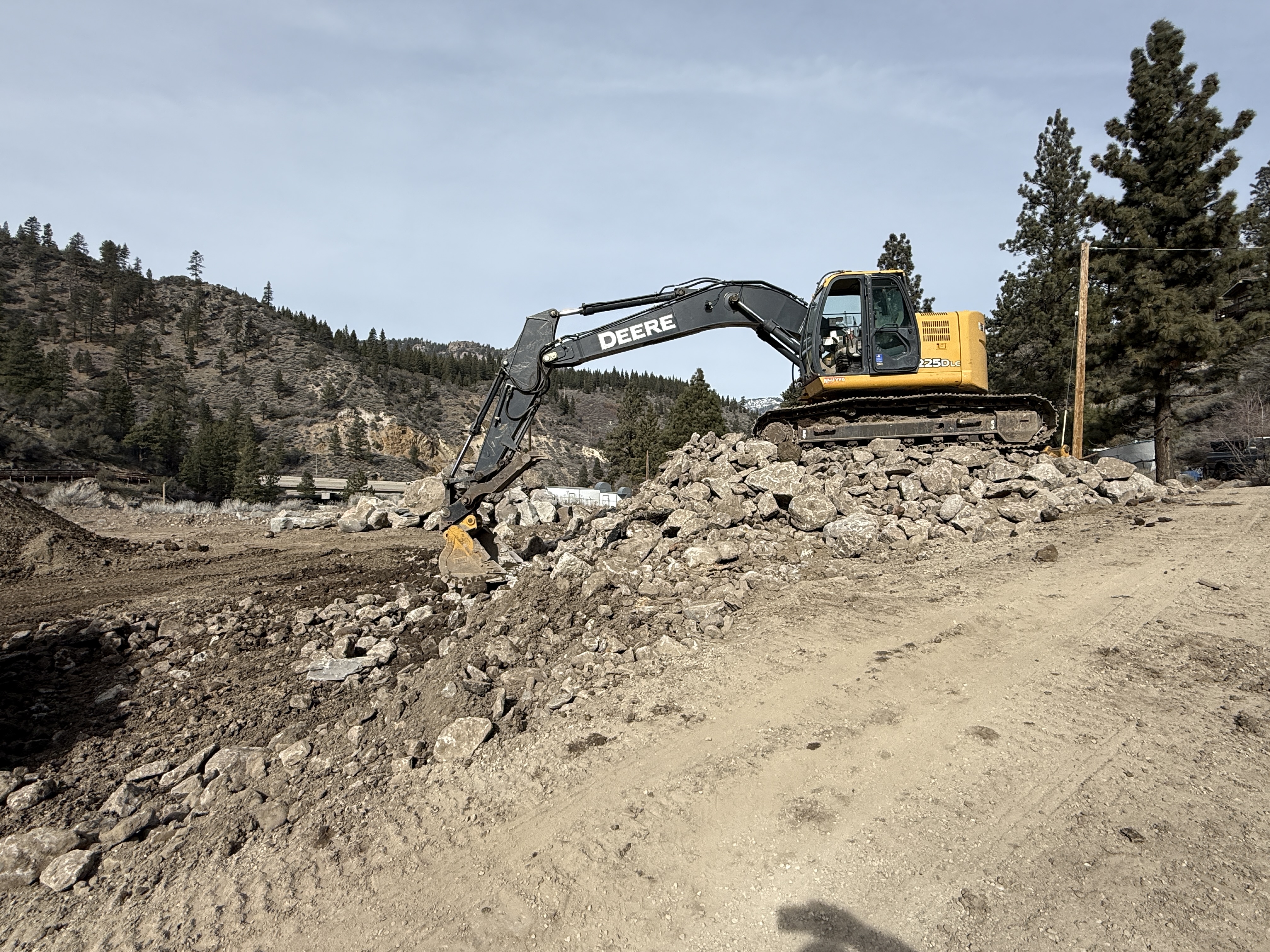 The photo shows a yellow and black excavator positioned on top of a pile of rocks on a construction site. The excavator's arm is extended toward the ground, suggesting activity either placing or moving rocks. The background includes hills with trees, indicating a rural or semi-rural location. There are no visible workers or vehicles besides the excavator.