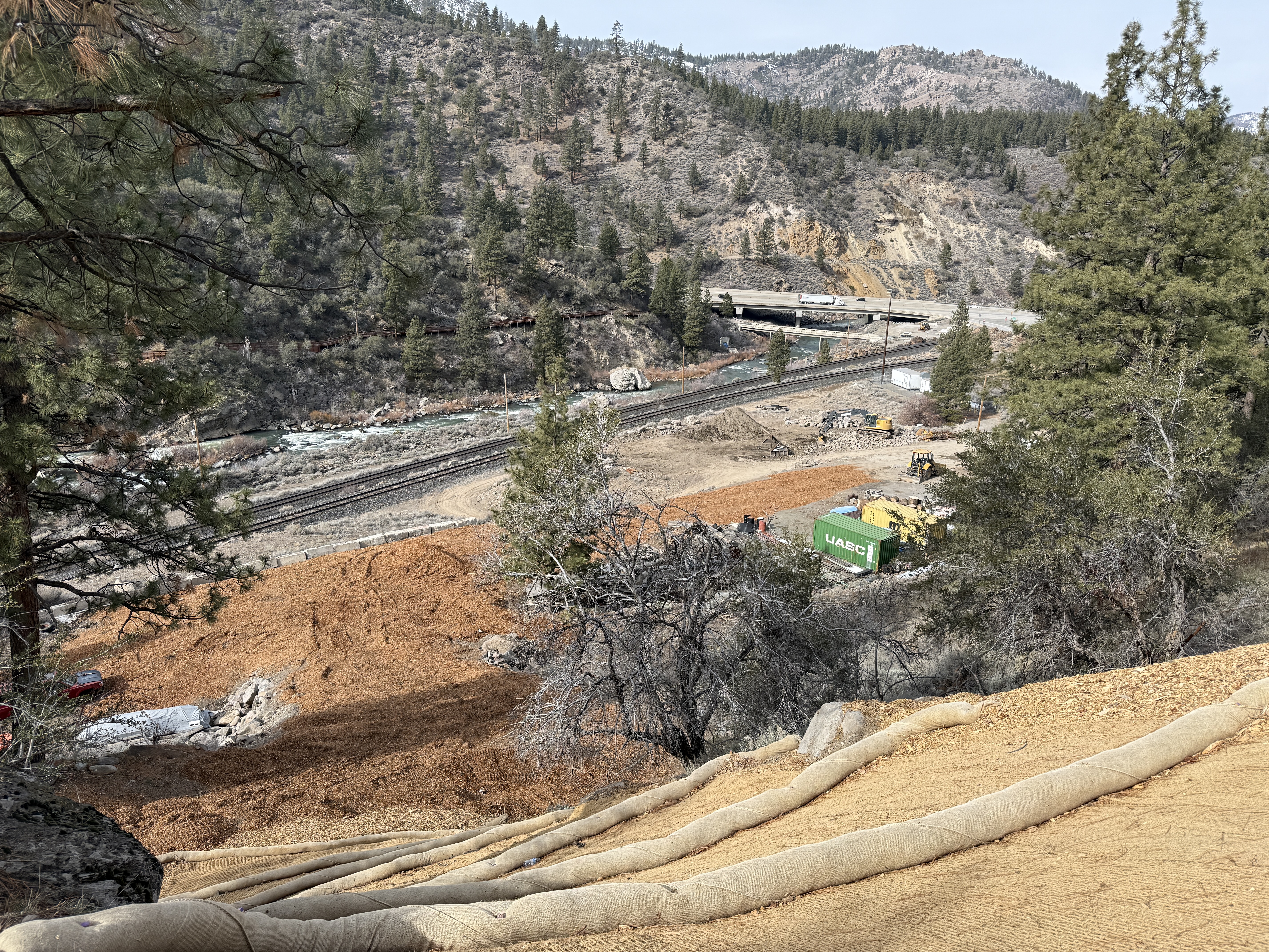 The image shows an area under SWPPP erosion control measures with erosion control matting laid out on a slope. In the background, a construction site with heavy machinery and containers is visible, indicating ongoing work. The site is located near a railway and a bridge with a river running alongside. Several trees surround the area, indicating a forested environment.