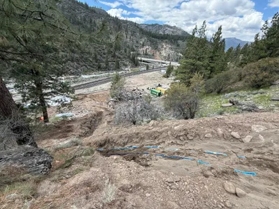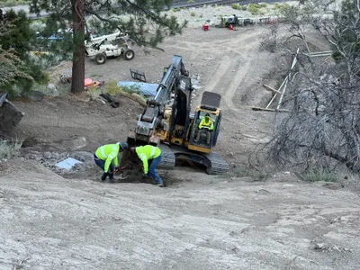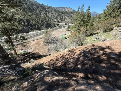 dirt and rocks clear weather, daytime lighting open site with visible staging area