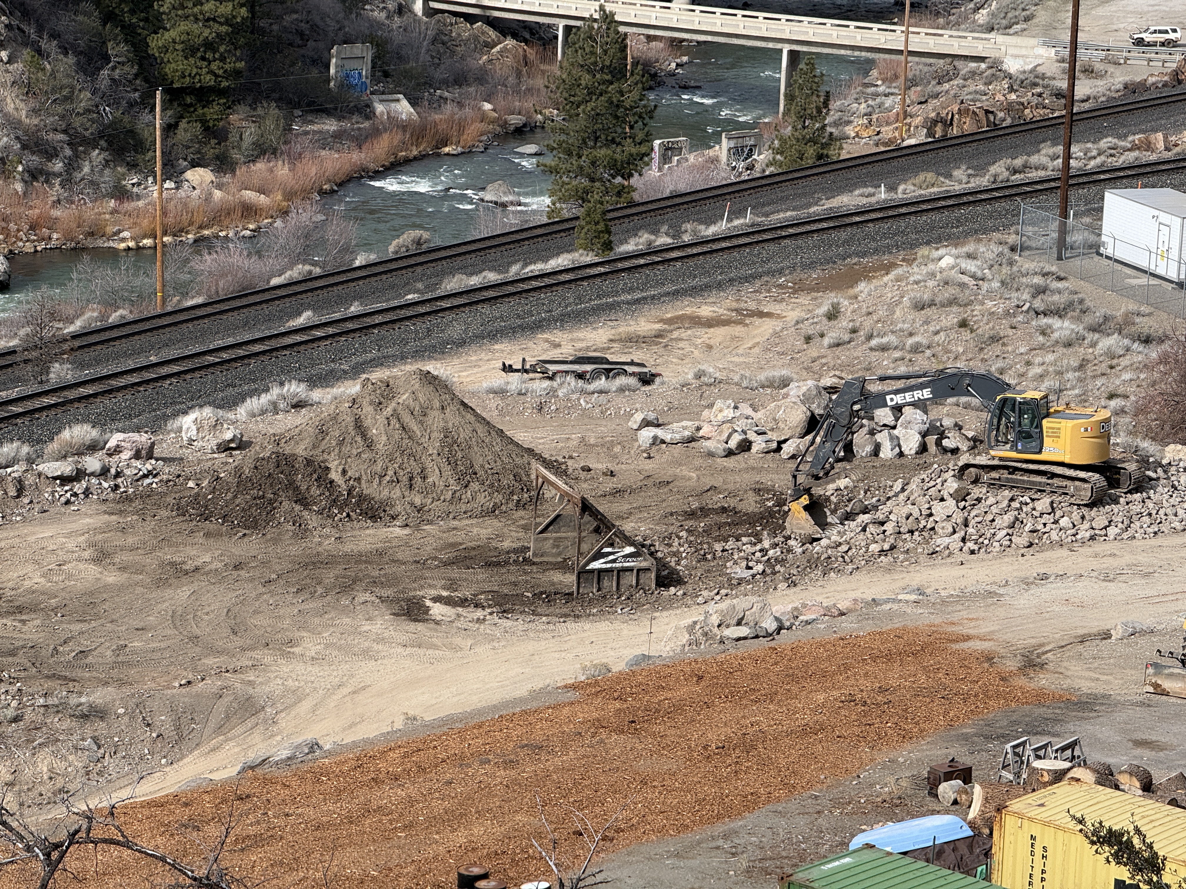 The image shows an excavator actively moving rocks and soil in a construction site. There is a pile of dirt in the center, and larger rocks being handled by the excavator on the right. A framework structure is visible near the dirt pile, possibly for sorting or screening soil. Railroad tracks and a river are in the background, with no visible personnel on site.