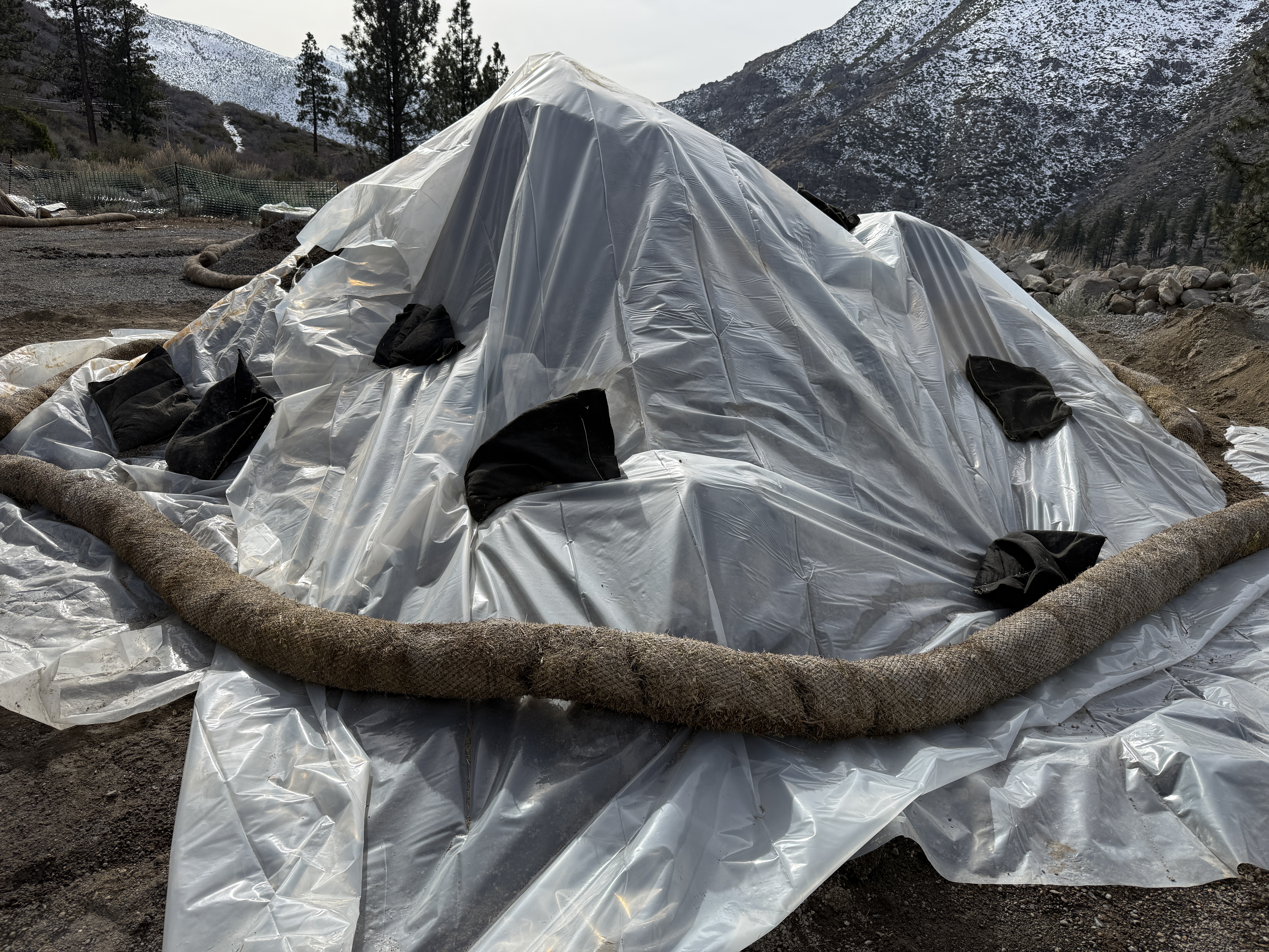 The image shows an erosion control setup at the Floriston Filtration Project site. The setup is covered with plastic sheeting and secured with weighted bags and erosion control barriers. The area is surrounded by natural terrain with visible snow on higher ground. This setup suggests measures for sediment control in a construction area.