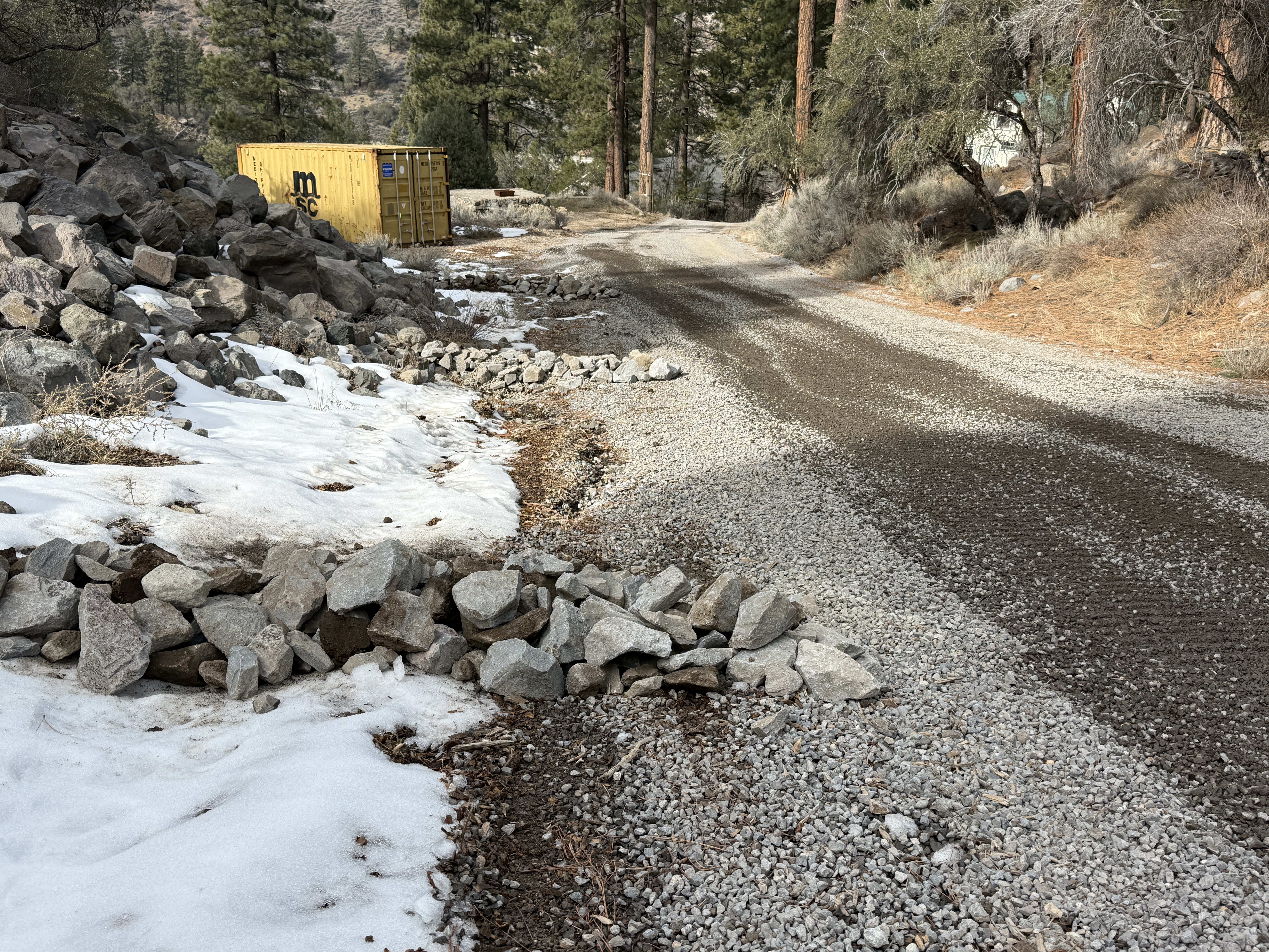 The image depicts a gravel path with erosion control measures in place, such as rock and gravel piles. A yellow shipping container is positioned in the background near a hill covered with stones and sparse vegetation. Snow is present on the ground, suggesting cold weather conditions.