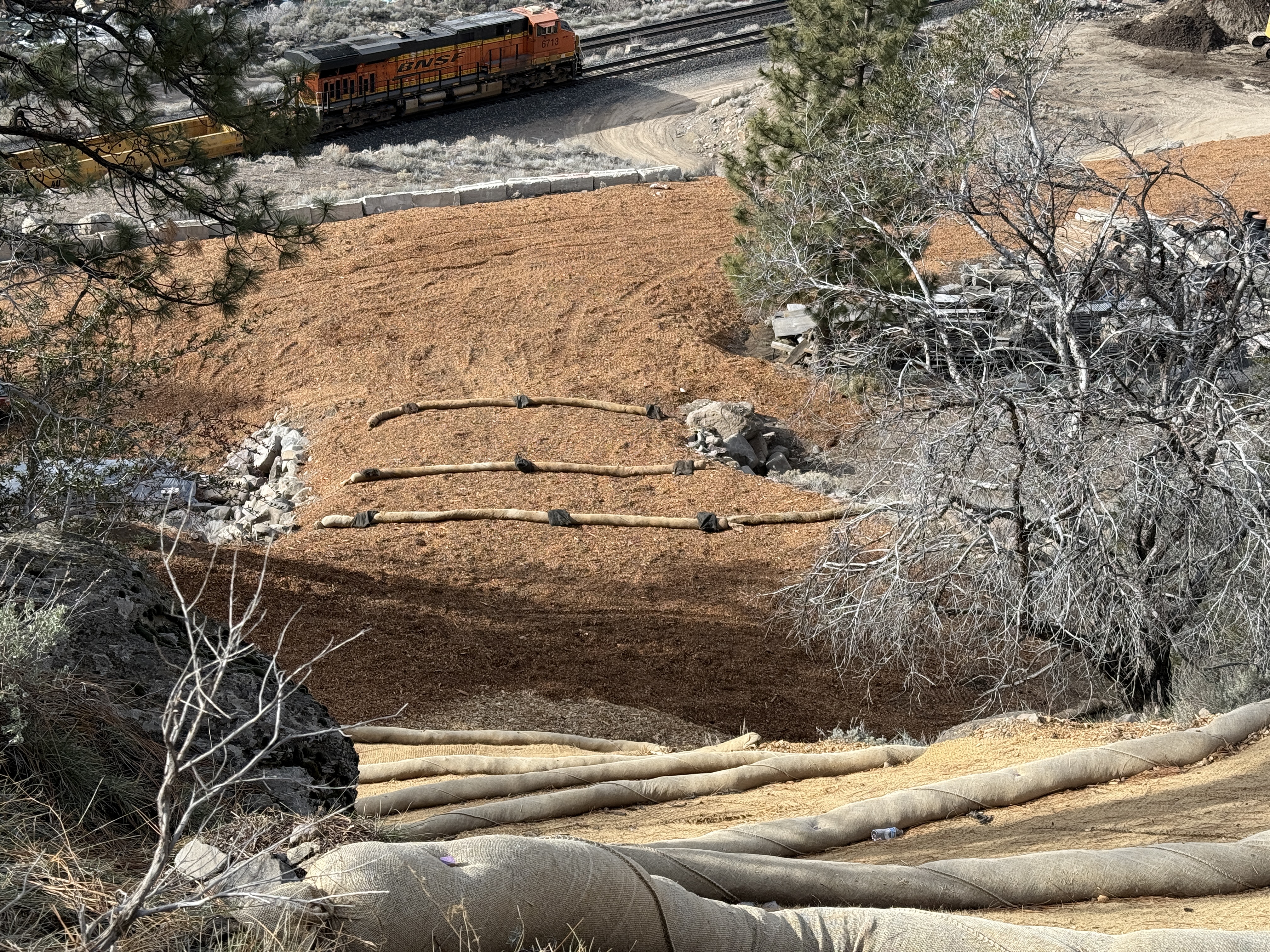 The image shows a slope covered with orange wood chips and multiple wattles for erosion control. Erosion control blankets are rolled out at the bottom of the slope. In the background, a train is passing on adjacent railway tracks. The positioning indicates recent installation of erosion control measures as part of SWPPP compliance.