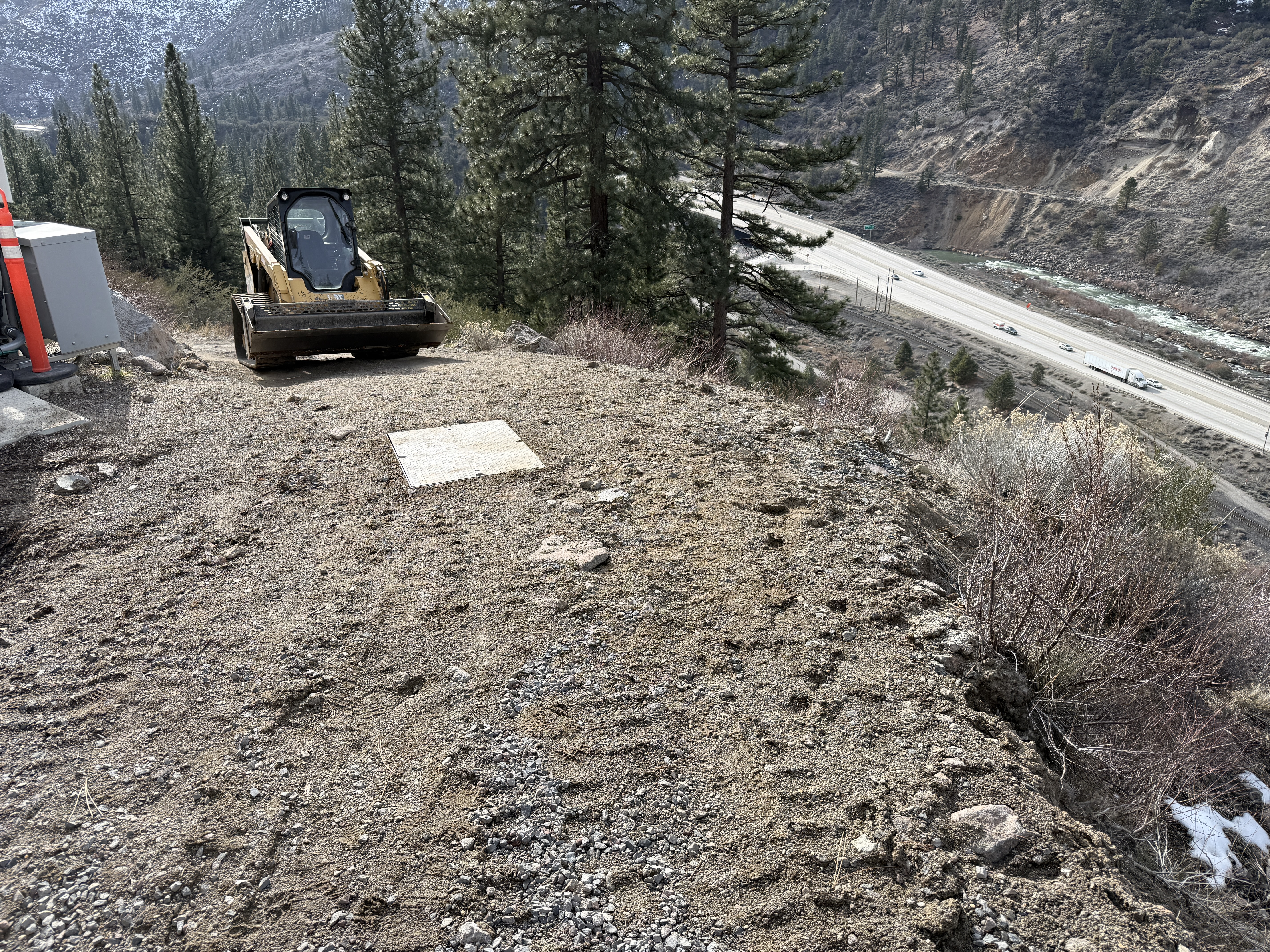 A compact track loader is positioned on a dirt embankment, surrounded by vegetation and overlooking a highway. The soil surface has visible tracks and appears to be part of an erosion control area. Beyond the embankment, the highway is visible with light traffic, and the surrounding area is forested with tall pine trees.