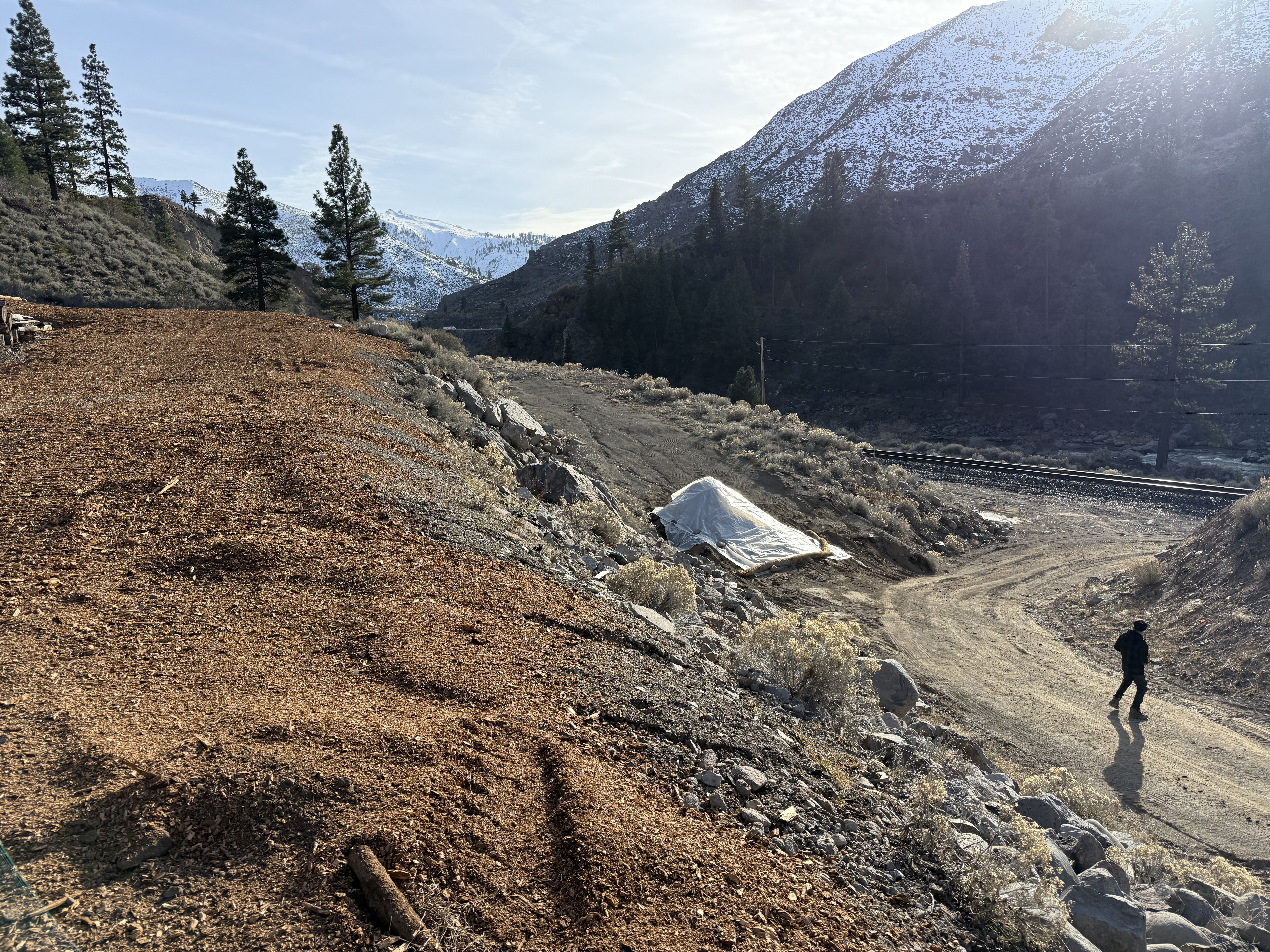 The image shows an area likely under erosion control measures with visible mulch spread over a slope. A dirt path runs through the scene with a tarp covering a pile. Snow-covered mountains and trees are in the background, indicating a cold climate. A person is walking along the path near the edge of the slope.