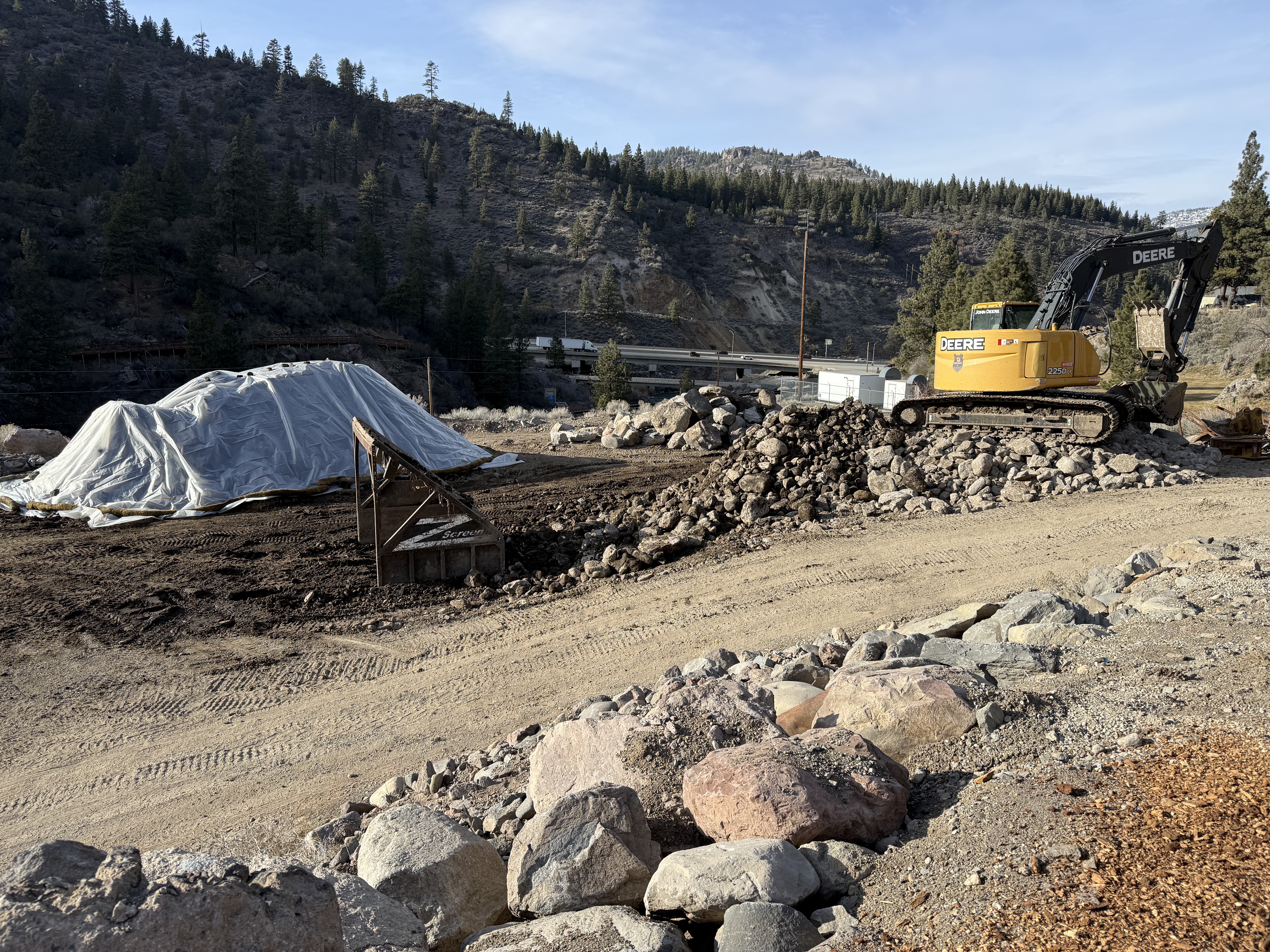 The image shows an excavator on the right next to a pile of rocks. A large cover, likely over materials or soil, is visible on the left. The setting is an open area with rocky terrain. The machinery and materials suggest ongoing construction activity, though specific tasks aren't clearly defined.