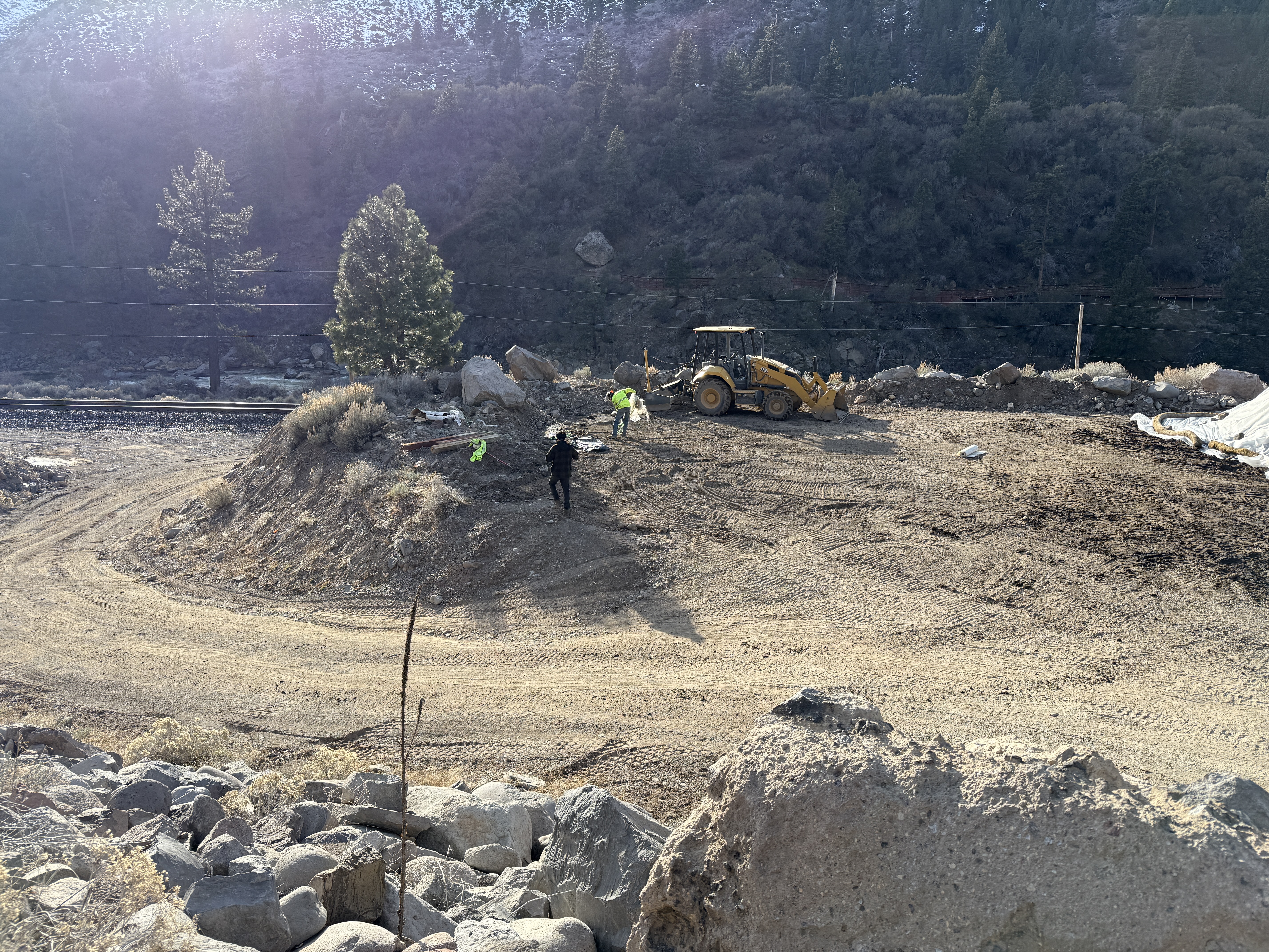The image shows a job site with a backhoe and two construction workers near a dirt mound. The workers are on uneven ground, with rocky surfaces visible in the foreground. The background includes industrial grading and potential erosion control measures. The equipment and personnel suggest erosion control activities but the precise phase is unclear.