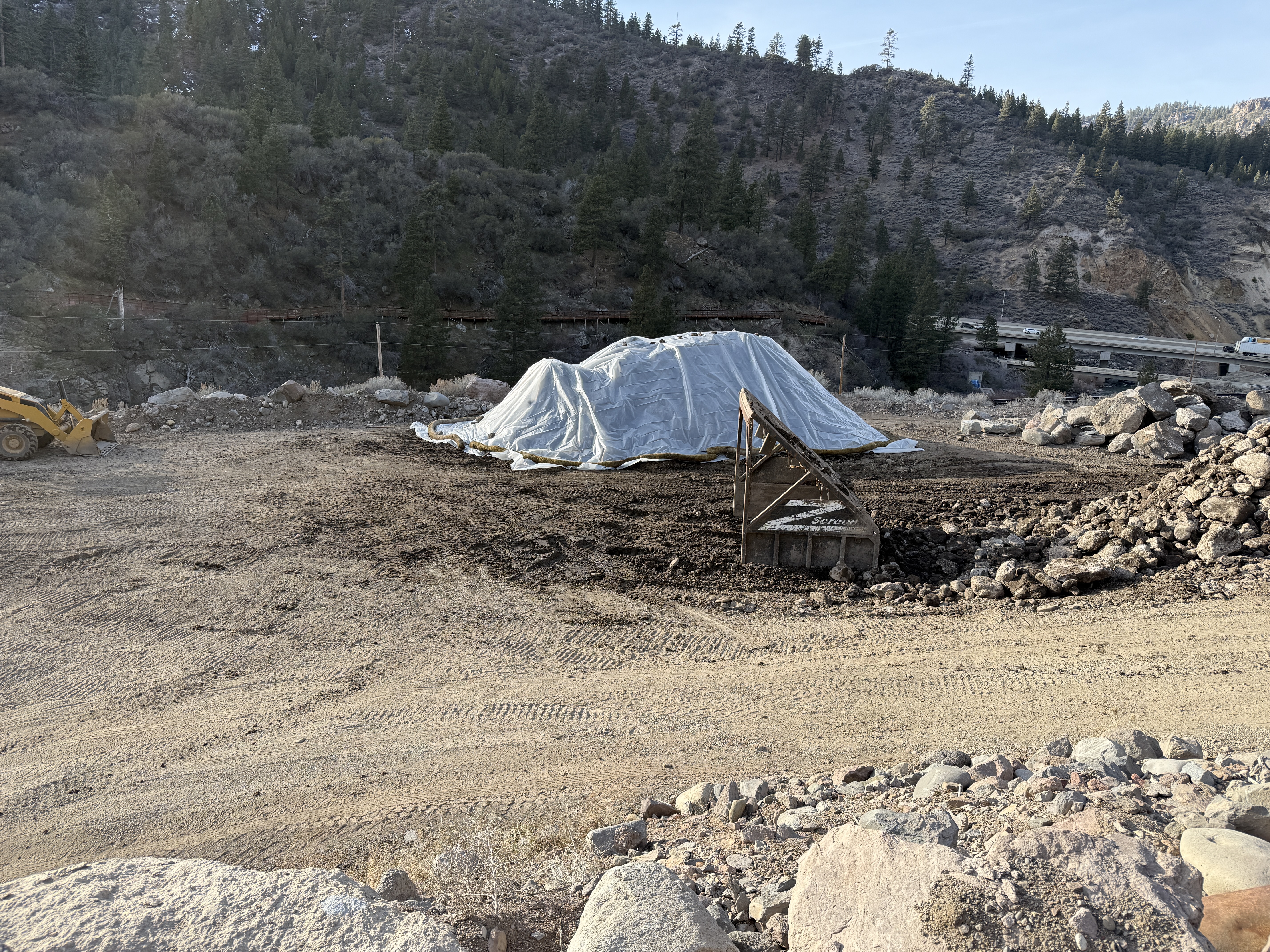 The image shows a construction site with a large tarp covering materials or equipment in the center. A loader is positioned on the left side of the image. There are piles of rocks and earth around the site, indicating site grading activity. The location is in a hilly or mountainous area, as visible by the terrain in the background.