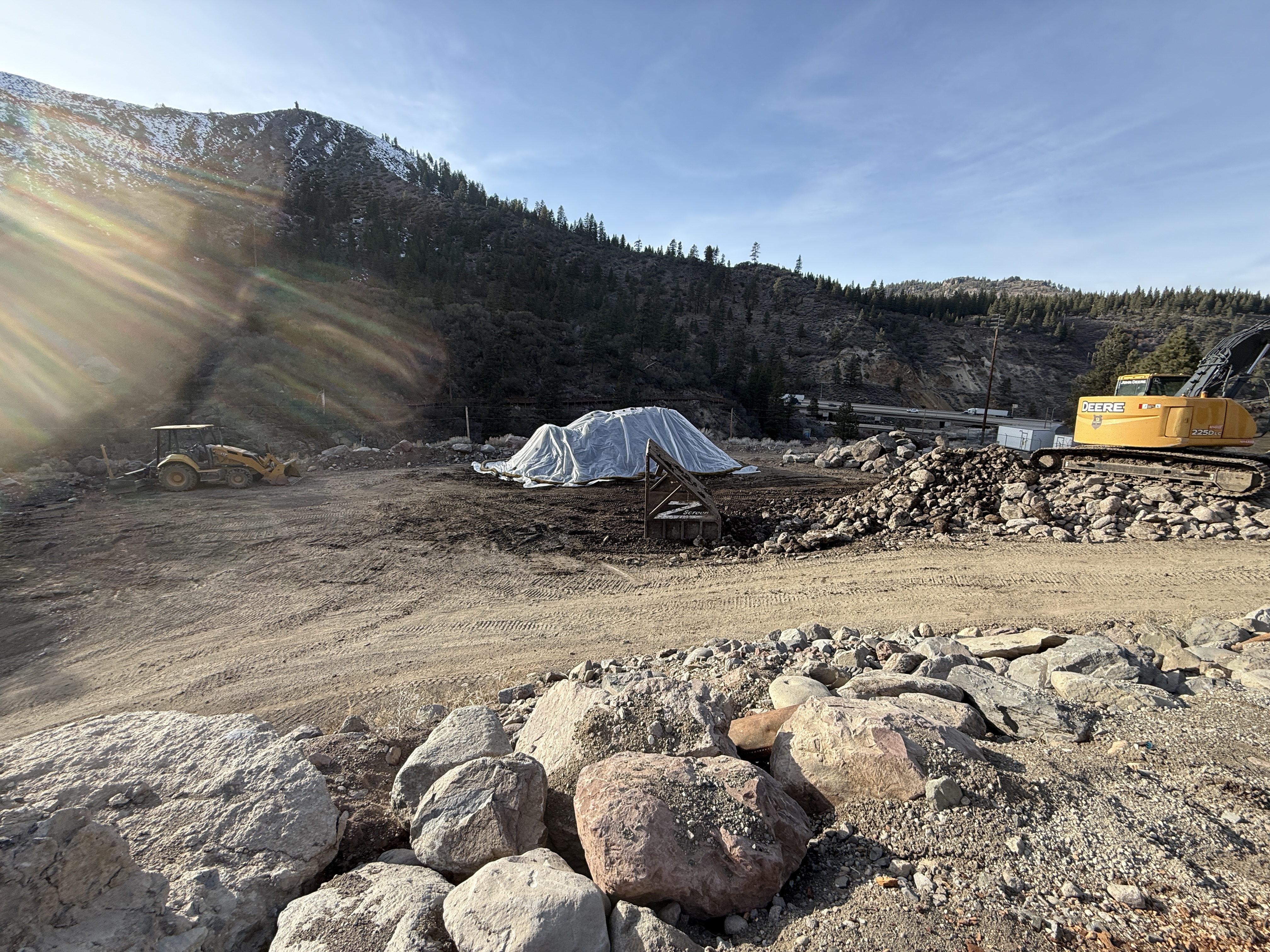 The image shows a construction site with earthwork activities, likely site grading, in progress. A large pile of rocks is visible with an excavator on top, and a backhoe loader is parked further away. There is a covered mound of material in the center. The background consists of forested hills under a clear sky with sunlight creating lens flares.