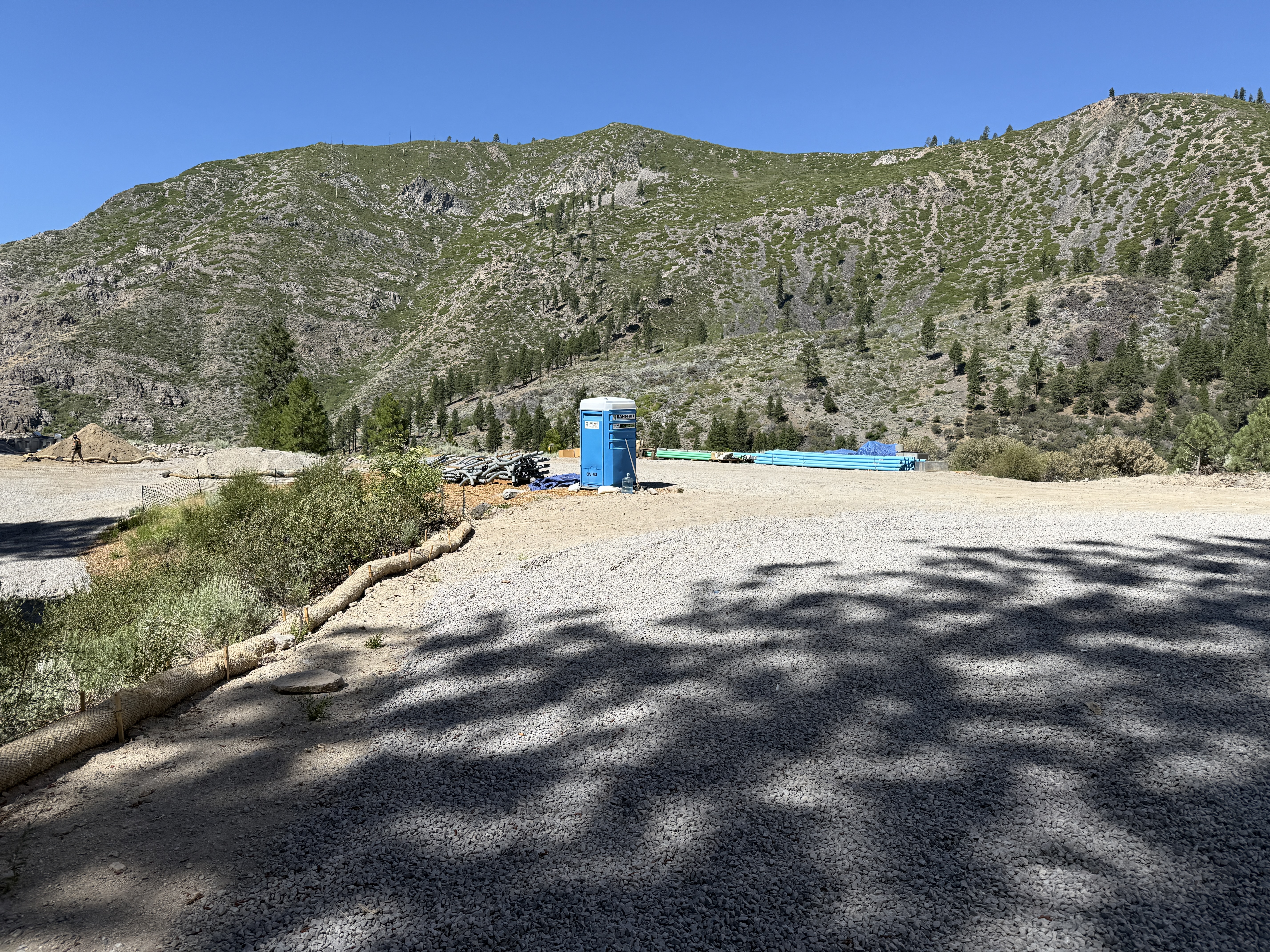 The image depicts a flat area covered with gravel, with a portable toilet located towards the center-right. Stacks of blue and green pipes are laid out in the background. Erosion control measures such as a sediment barrier are visible along the edge of the gravel area. The site is surrounded by hills with sparse vegetation, indicating a rural or undeveloped setting. There are no active work activities observed in the image.