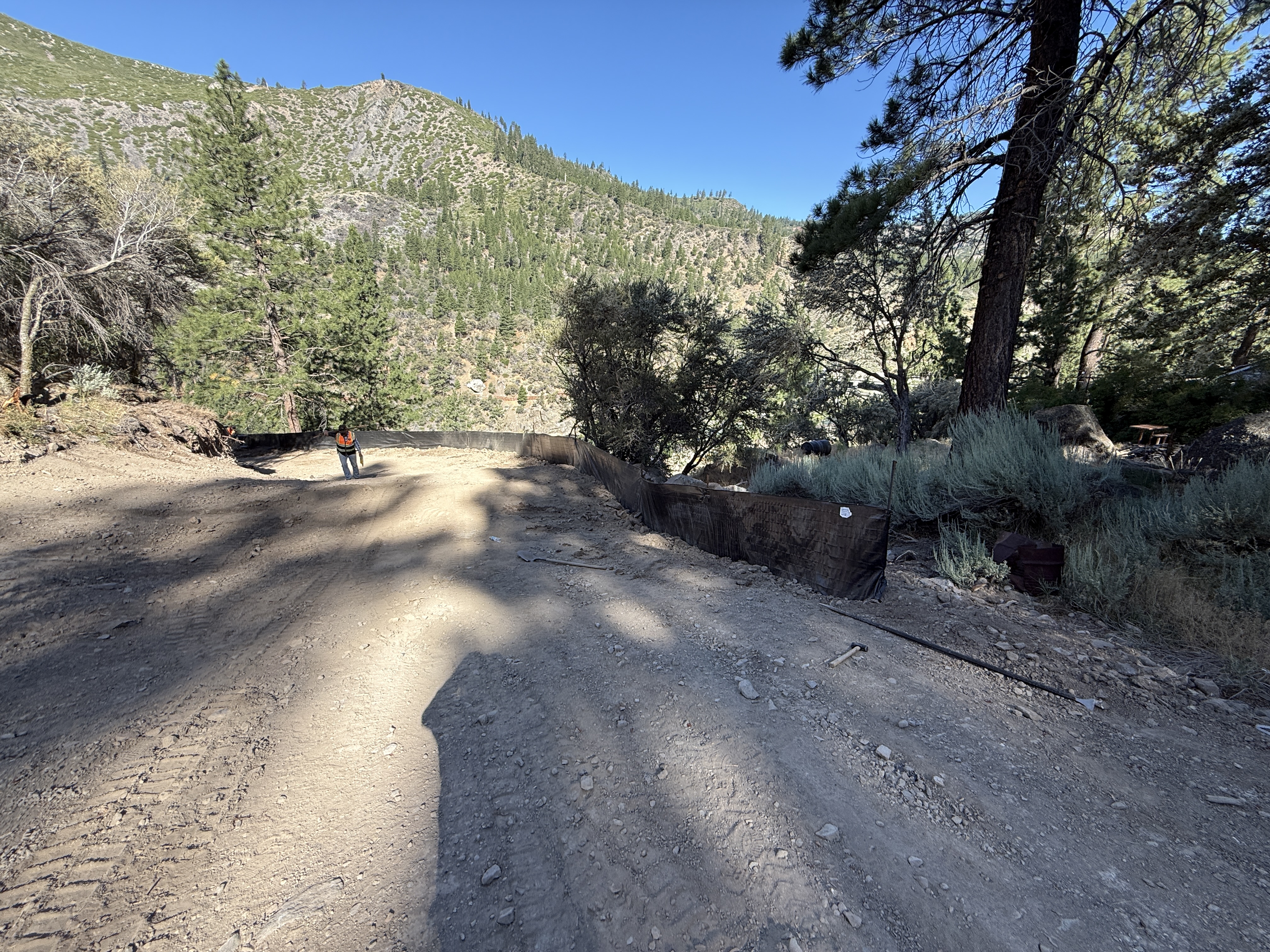 The image shows a dirt access road with a person wearing safety gear in the midground. Silt fencing is installed along the right side of the road, likely for erosion control. The area is surrounded by trees, and the ground surface appears uneven with visible tire marks. The sky is clear, indicating good weather conditions.