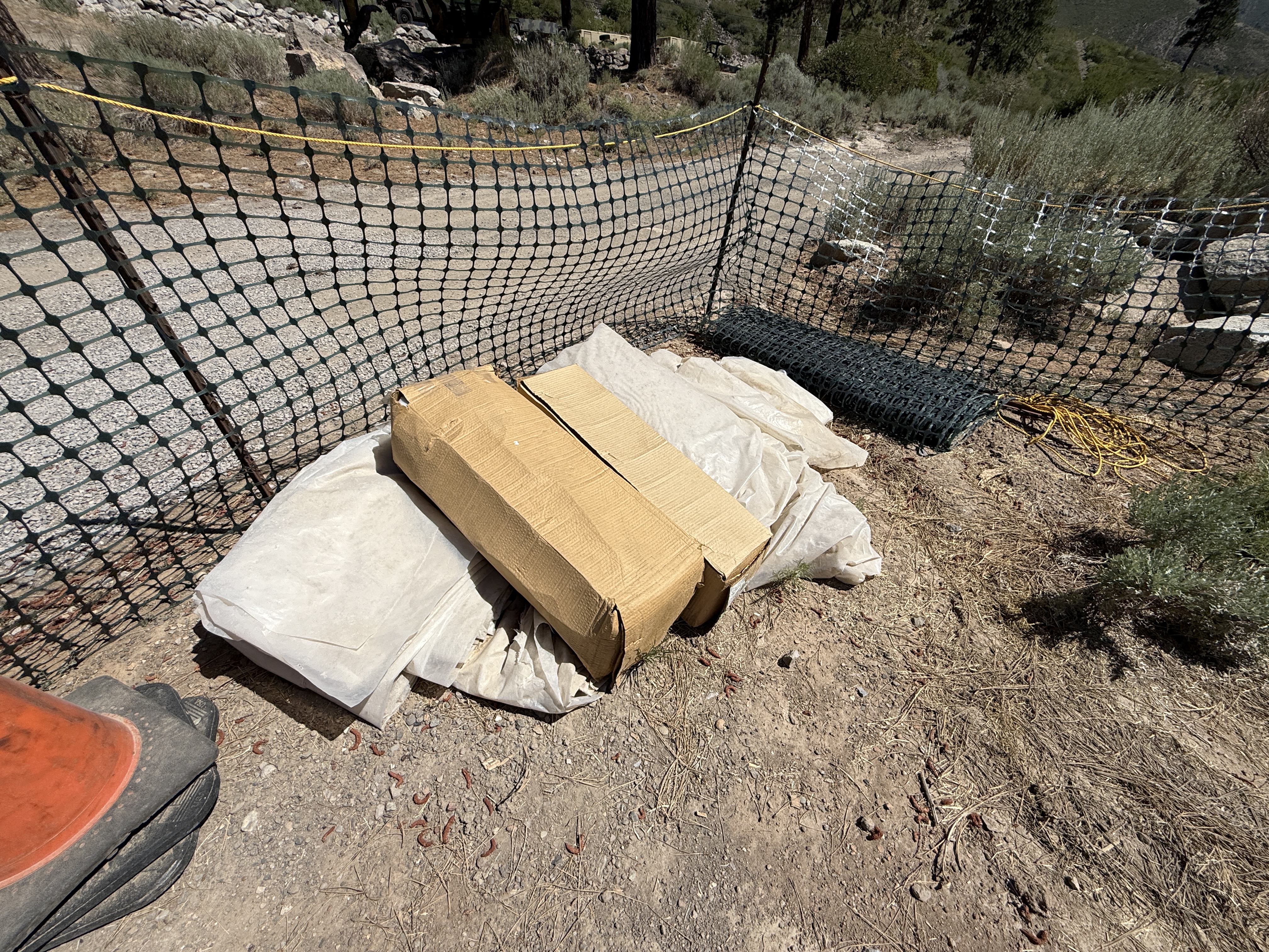 The image shows a section of the SWPPP area with various materials placed on the ground. A roll of fencing is positioned against a temporary mesh fence, next to a large cardboard box and plastic sheeting. The scene includes vegetation and dirt, indicating an outdoor construction environment.