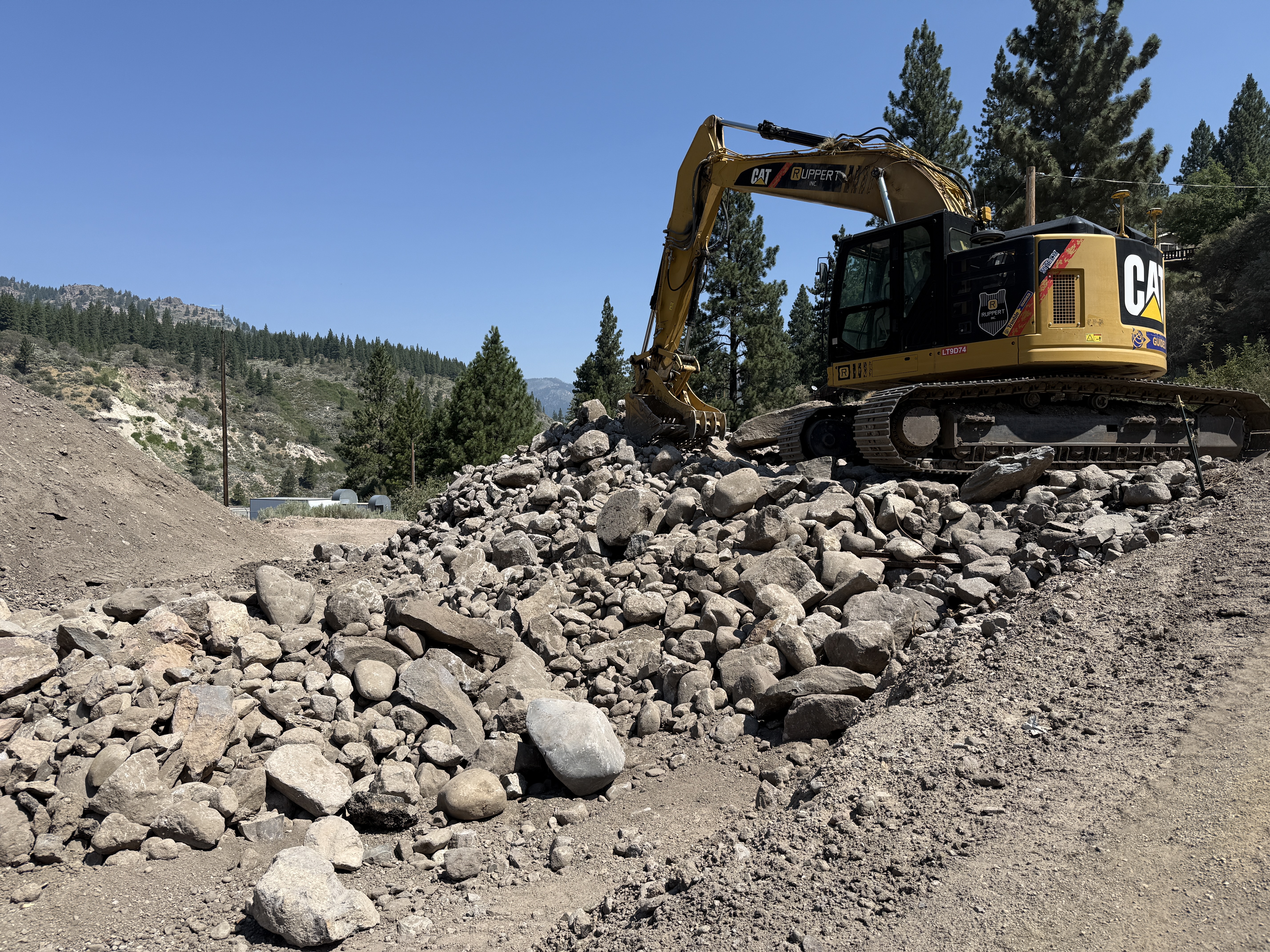 The image shows an excavator positioned on a pile of rocks at a construction site. The landscape in the background includes trees and hills. There is a clear sky indicating good weather. The surface is uneven with loose rock and dirt.
