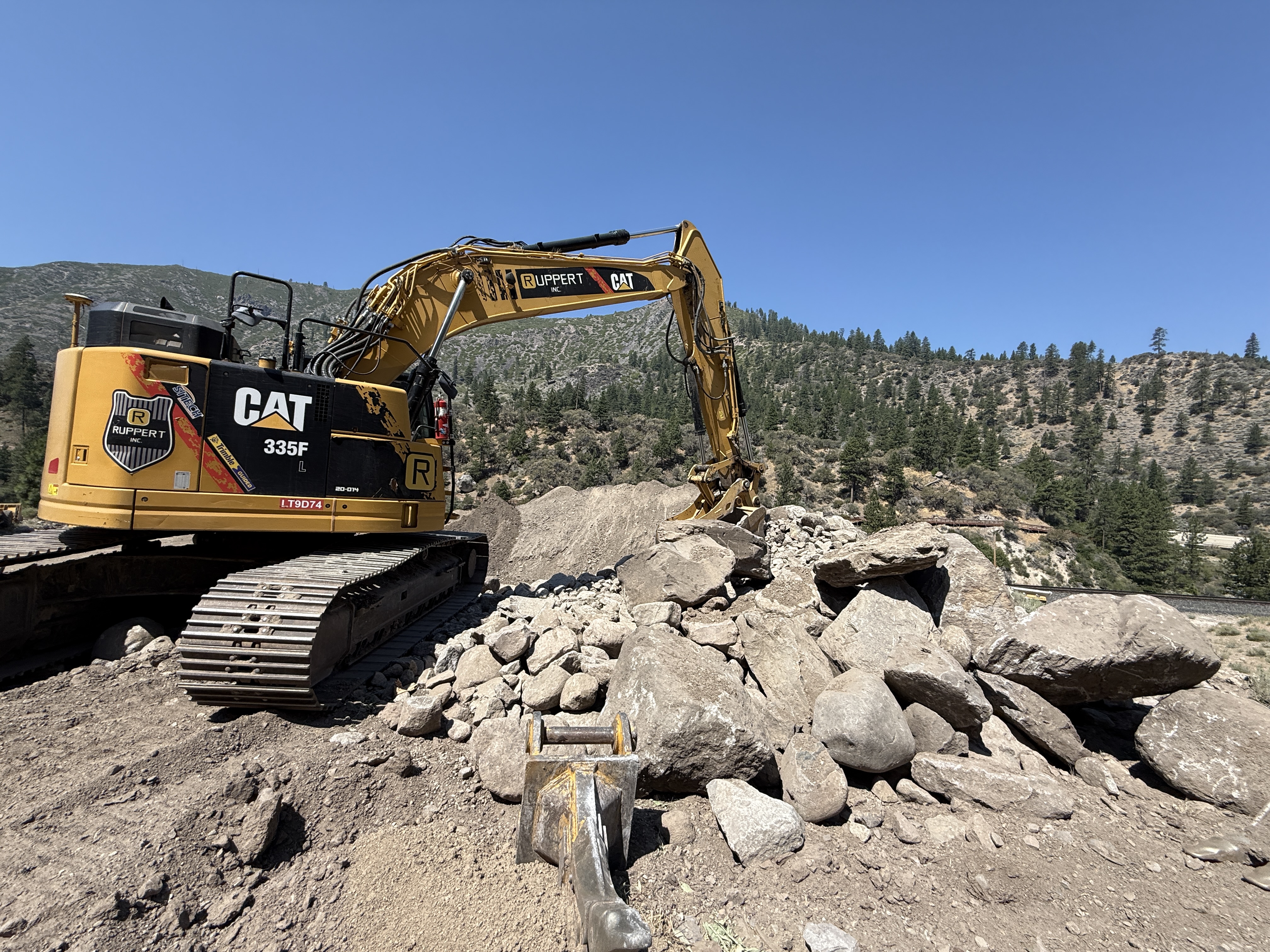 A Caterpillar excavator is positioned on uneven terrain and is engaged in moving a pile of large boulders. The machine is situated on a rocky, sloped area with visible earth and rocks. Trees and hillside are in the background, indicating work in a natural or semi-natural area.