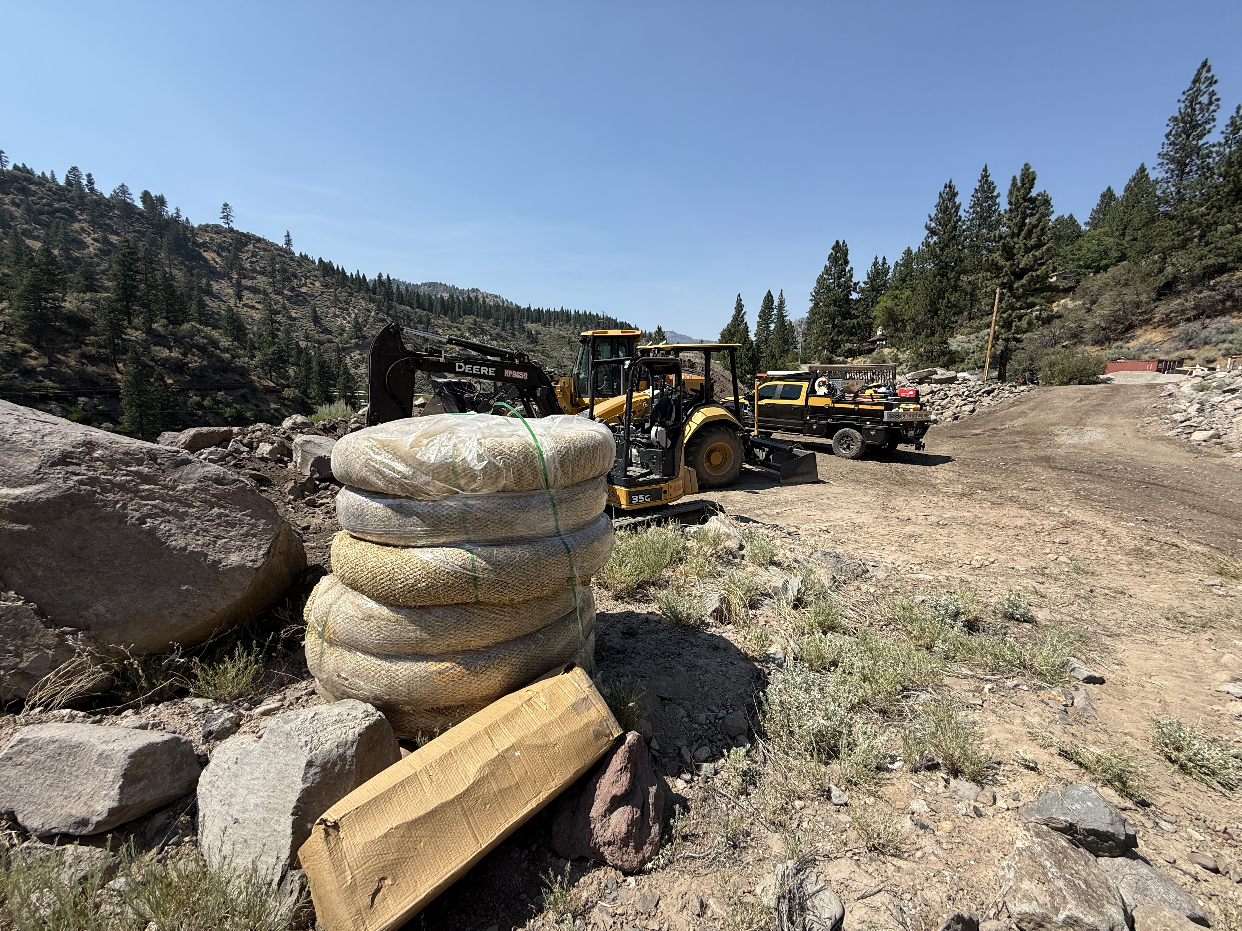 The image shows a construction site with straw wattles neatly stacked in the foreground, indicating erosion control preparation. A backhoe loader and a utility vehicle are stationed nearby, suggesting ongoing site work. The terrain appears rocky and uneven, with trees and hills in the background indicating a rural or mountainous setting. No visible personnel or active construction work is occurring in this frame.