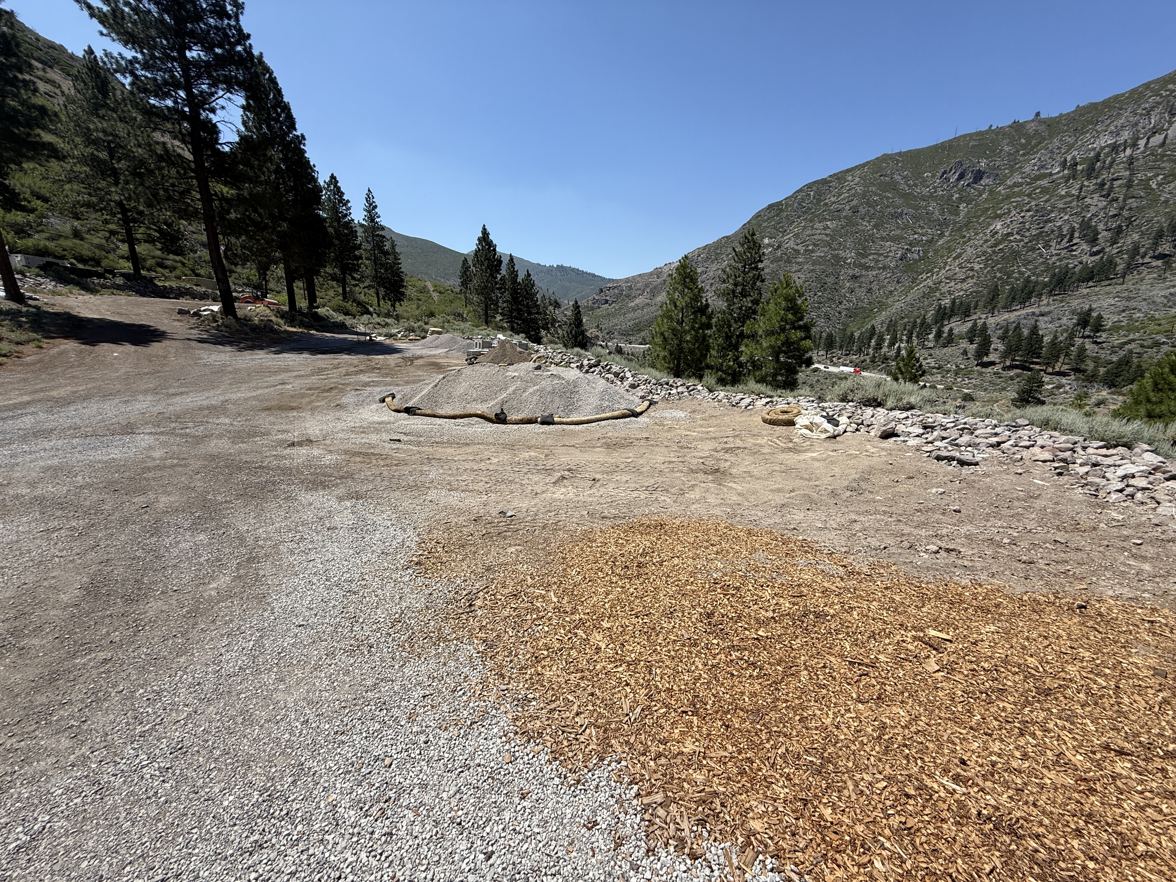 The image depicts a construction area in a mountainous region, primarily focused on site grading and erosion control. Gravel is spread across parts of the site, and an erosion control wattle is positioned on the ground. The terrain is uneven with a mixture of gravel, dirt, and mulch. Trees border the area, and no active equipment or personnel are visible.