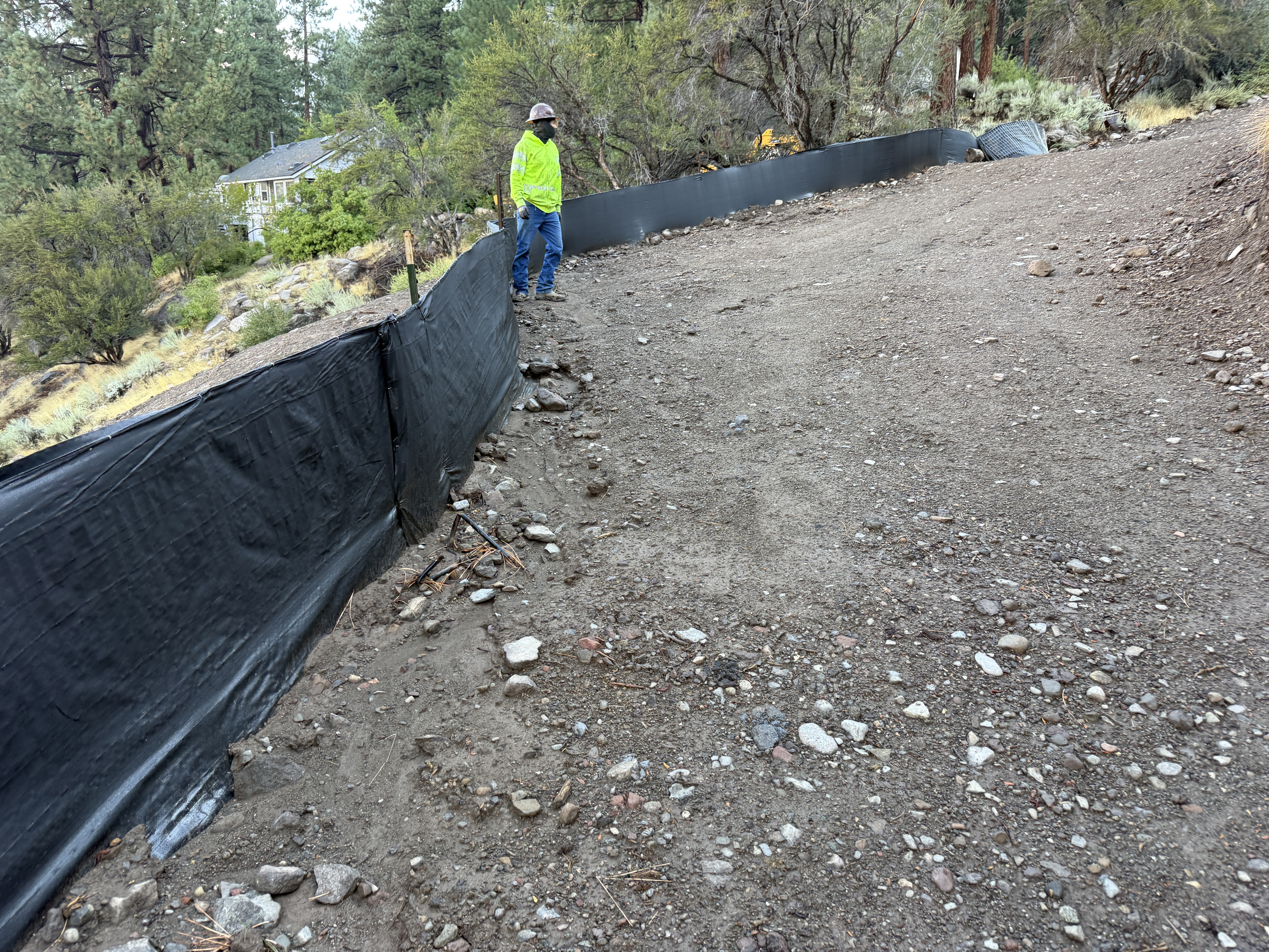 The image shows a silt fence installed along a sloped dirt pathway. A person wearing safety gear stands adjacent to the fence. The area contains loose soil and scattered rocks, indicating recent earth disturbance. The silt fence appears to act as an erosion control measure on site.