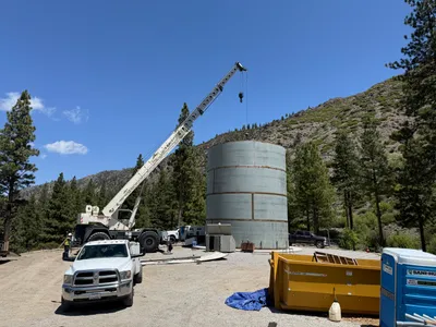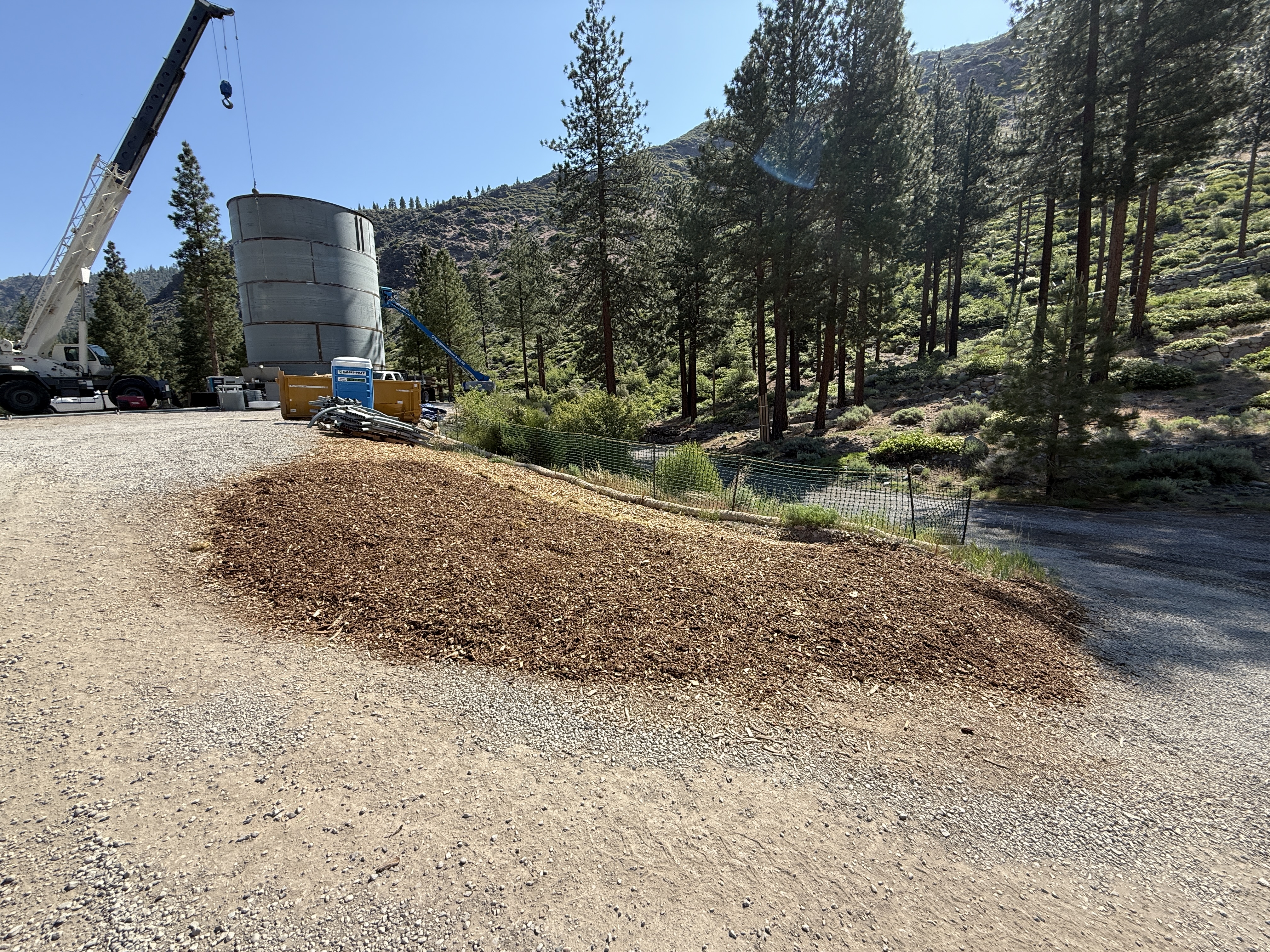 The image shows a site with visible efforts related to SWPPP erosion control. A large cylindrical tank is being maneuvered with the assistance of a crane. Nearby, there is a freshly mulched area that appears to be part of erosion control measures. The site is surrounded by trees and is on a gently sloping terrain.