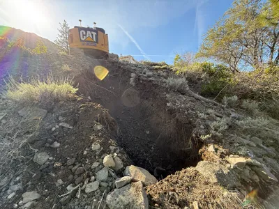 The image shows a dirt slope with erosion control measures in place, including a line of wattles. A blue pipe is laid on the ground next to an open area with additional piping emerging from the soil. A tree is present near the center of the slope.