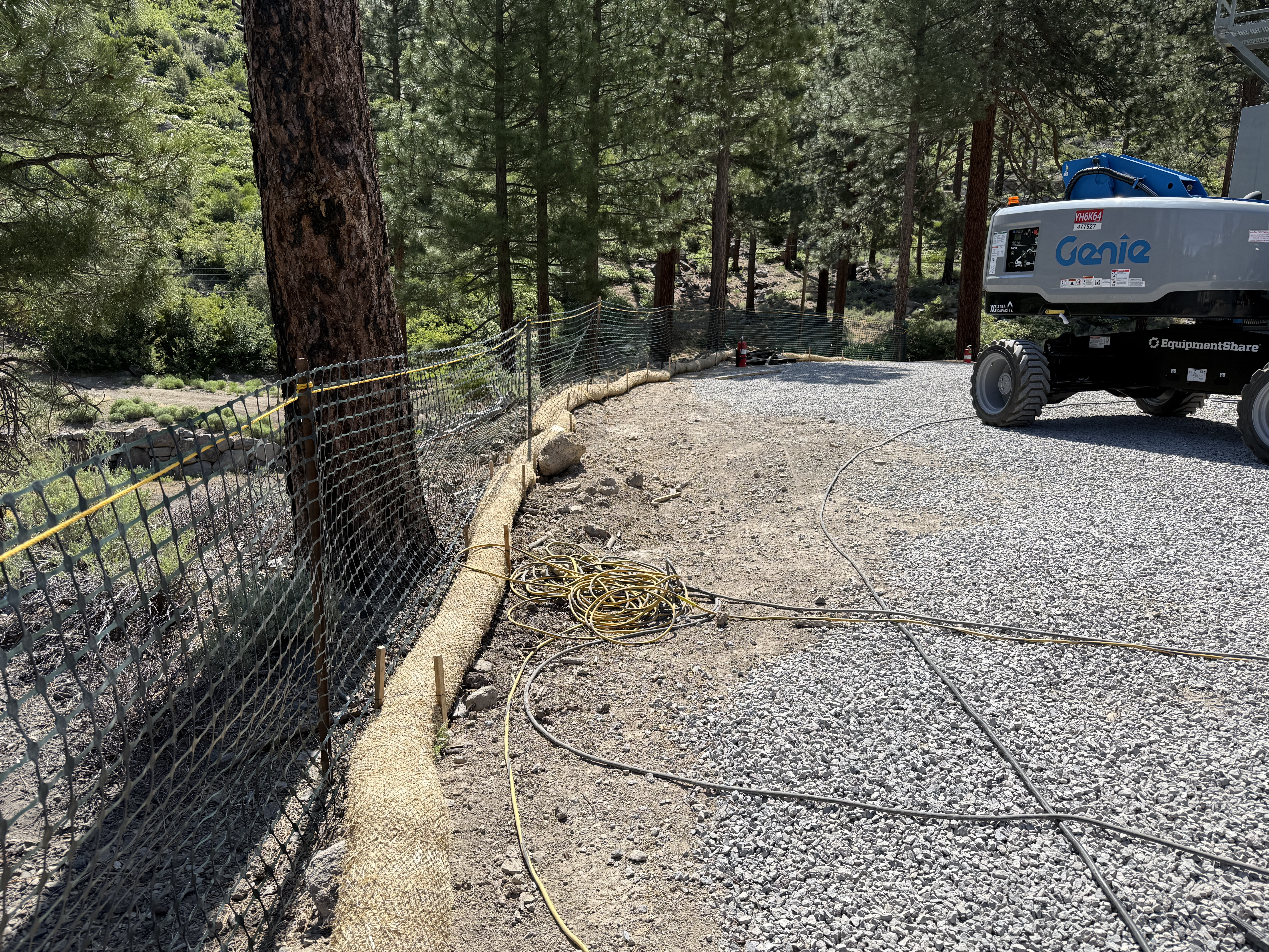 The image shows erosion control measures on a construction site, with black silt fencing installed along a gravel path on the left side. Erosion control wattles are placed adjacent to the fencing. A piece of heavy equipment is parked on the right side, and electrical cables are lying on the ground. The area is surrounded by a forested environment.