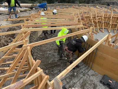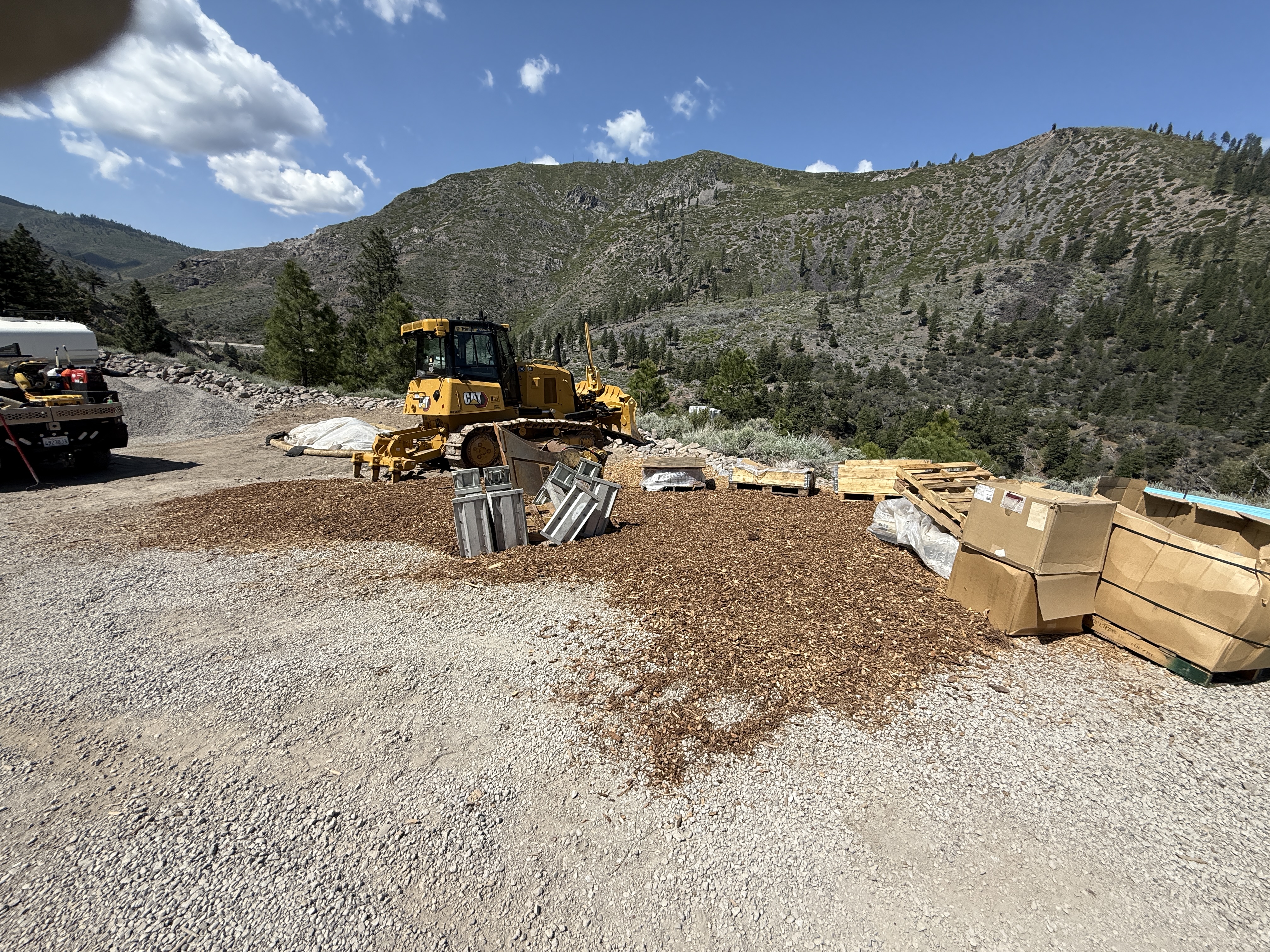 The image shows a construction site in a mountainous area, focused on SWPPP activities with erosion control measures. A bulldozer is visible, along with pallets and packaged construction materials on a gravel area, suggesting preparation for further work. Shredded wood chips are spread across part of the site for erosion control. The sky is clear with sunlight, and the surrounding hills are visible.