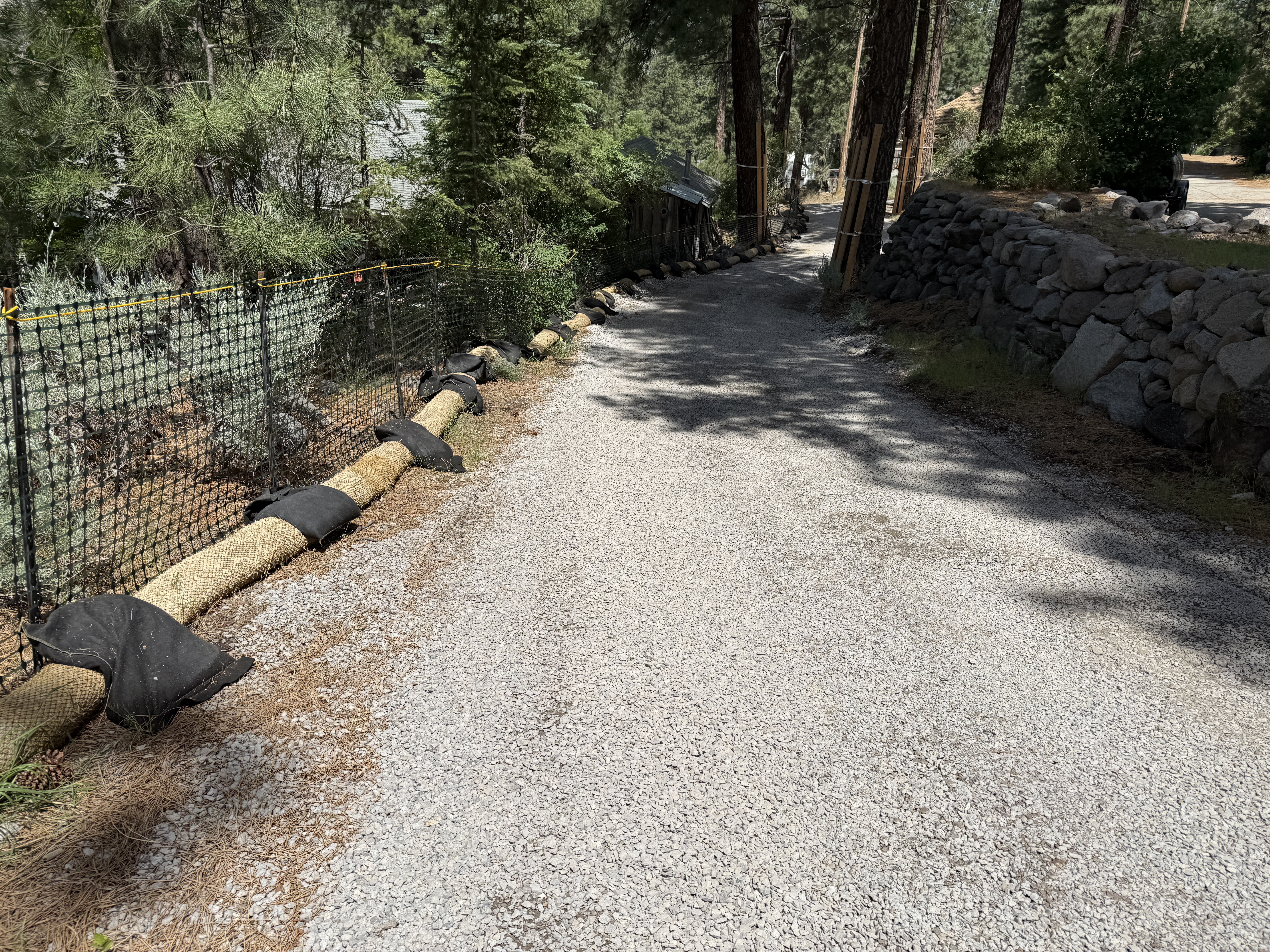 The image shows a gravel road flanked by straw wattles reinforced with sandbags and a black silt fence on the left side. The sandbags are placed at intervals to secure the wattles in position. A rock wall is visible on the right, suggesting boundary demarcation. The area is surrounded by trees, indicating a natural setting.