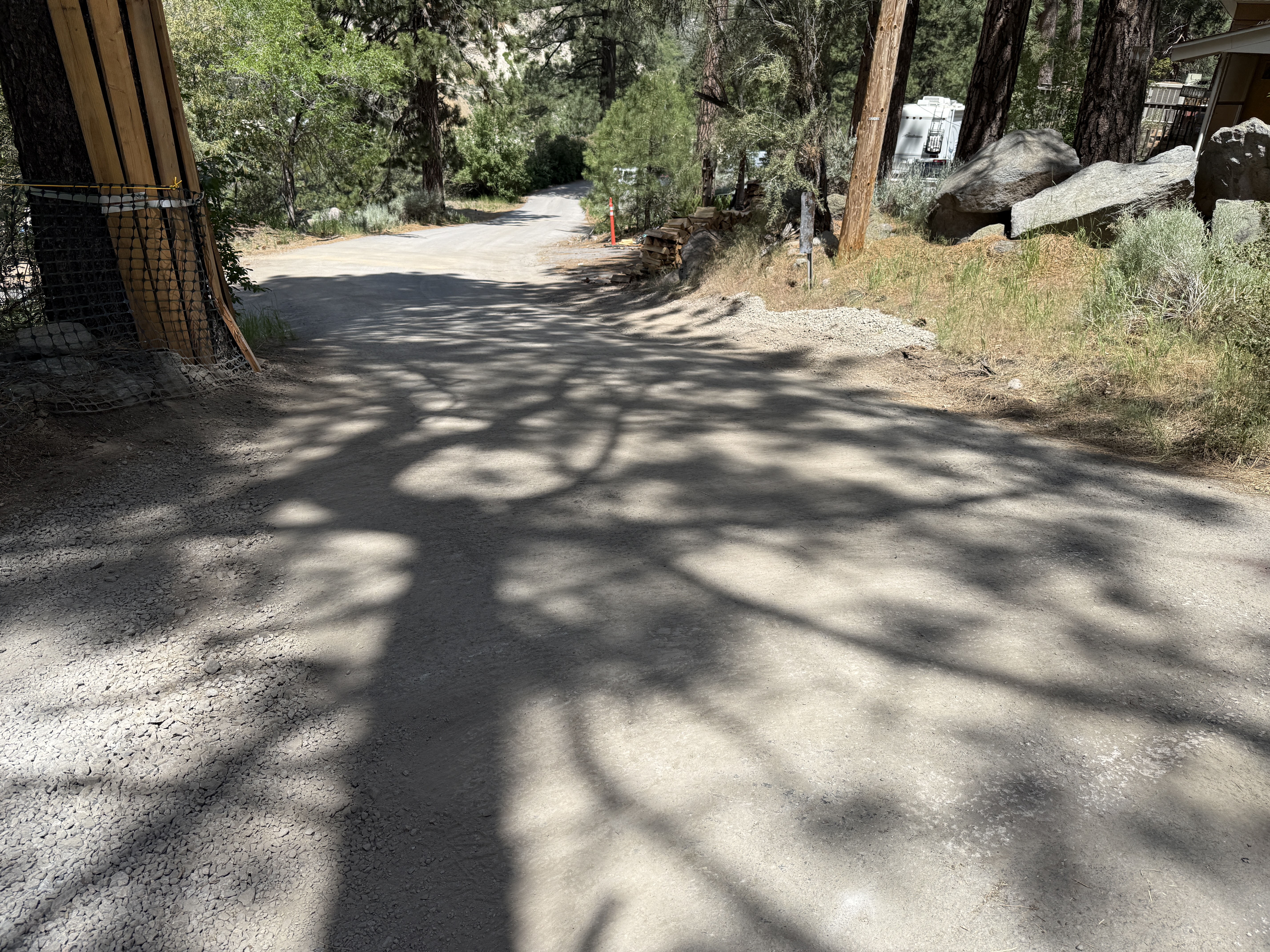 The image shows a dirt road within a wooded area, with distinct shadows cast by trees. On the left, there's a wooden structure attached to a tree, possibly for support or protection. To the right, boulders and greenery line the edge of the road. An RV or trailer is partially visible in the background, suggesting a nearby campsite or storage.