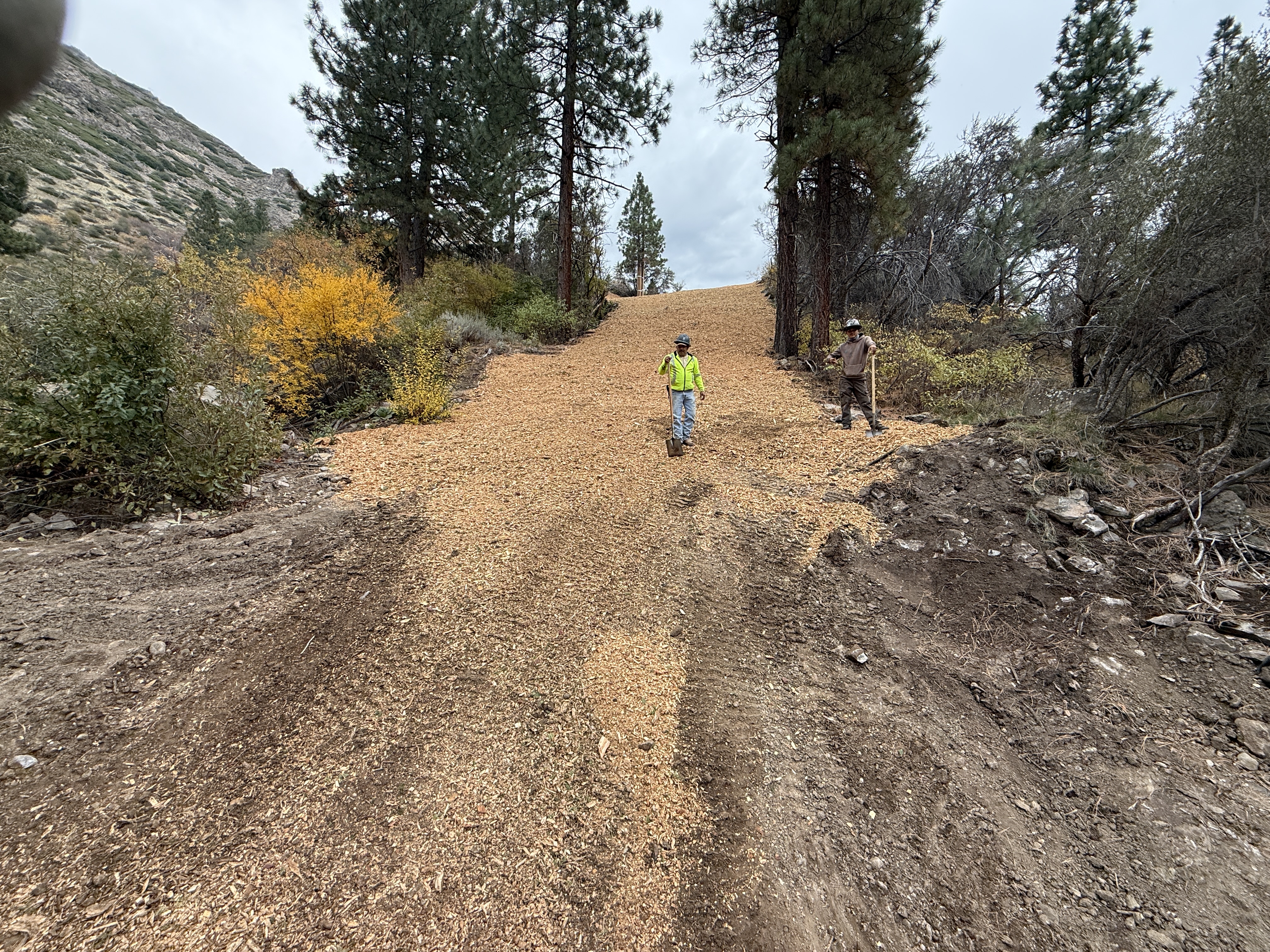 slope with wood chips and dirt overcast conditions access on foot