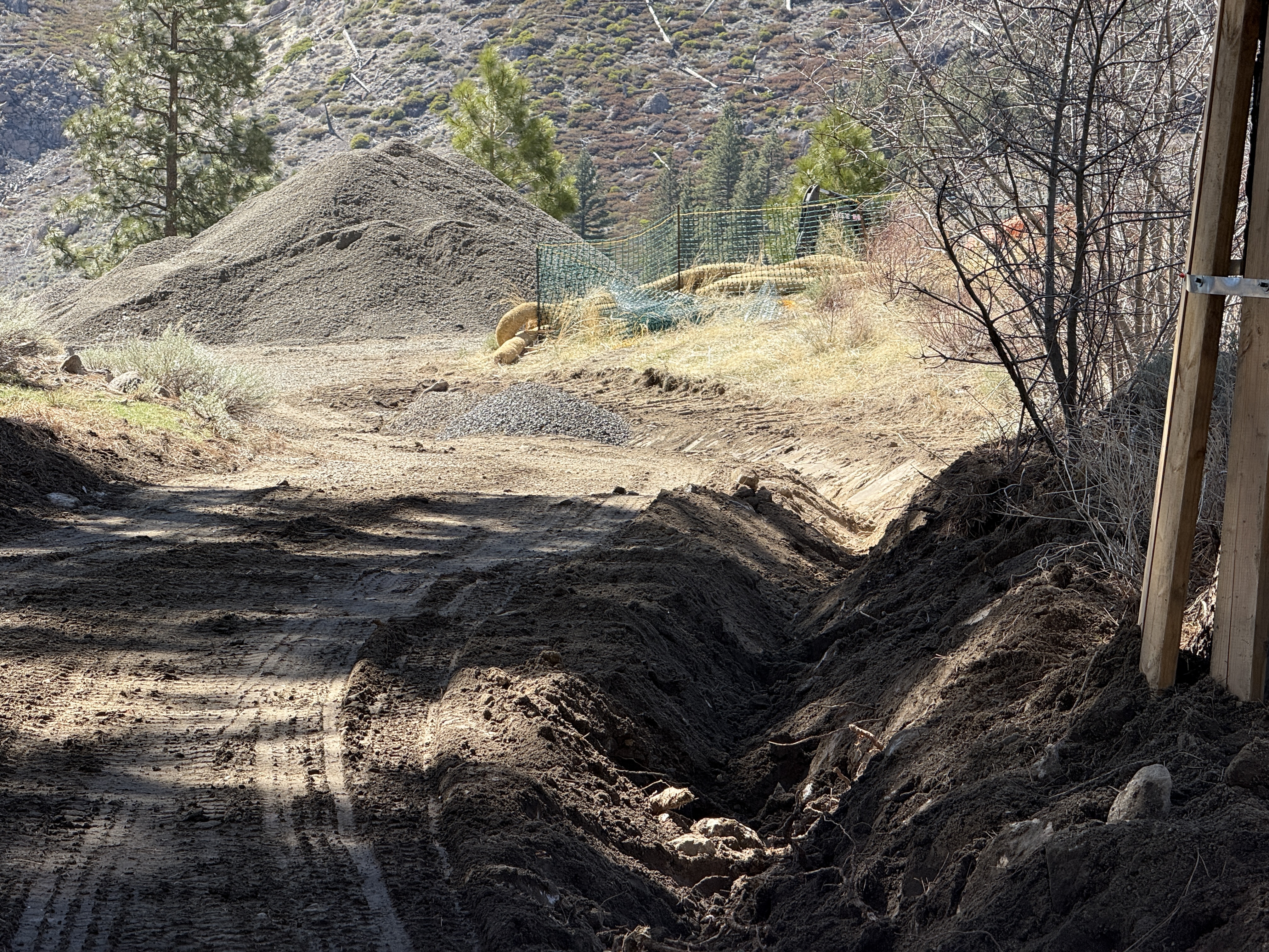 The image shows an excavated trench alongside a road, with tire tracks visible on the dirt surface. A large pile of gravel is located at the end of the trench, with some loose gravel scattered nearby. A green safety fence and erosion control measures like straw wattles are visible in the background. Trees and natural vegetation are in the surrounding area.