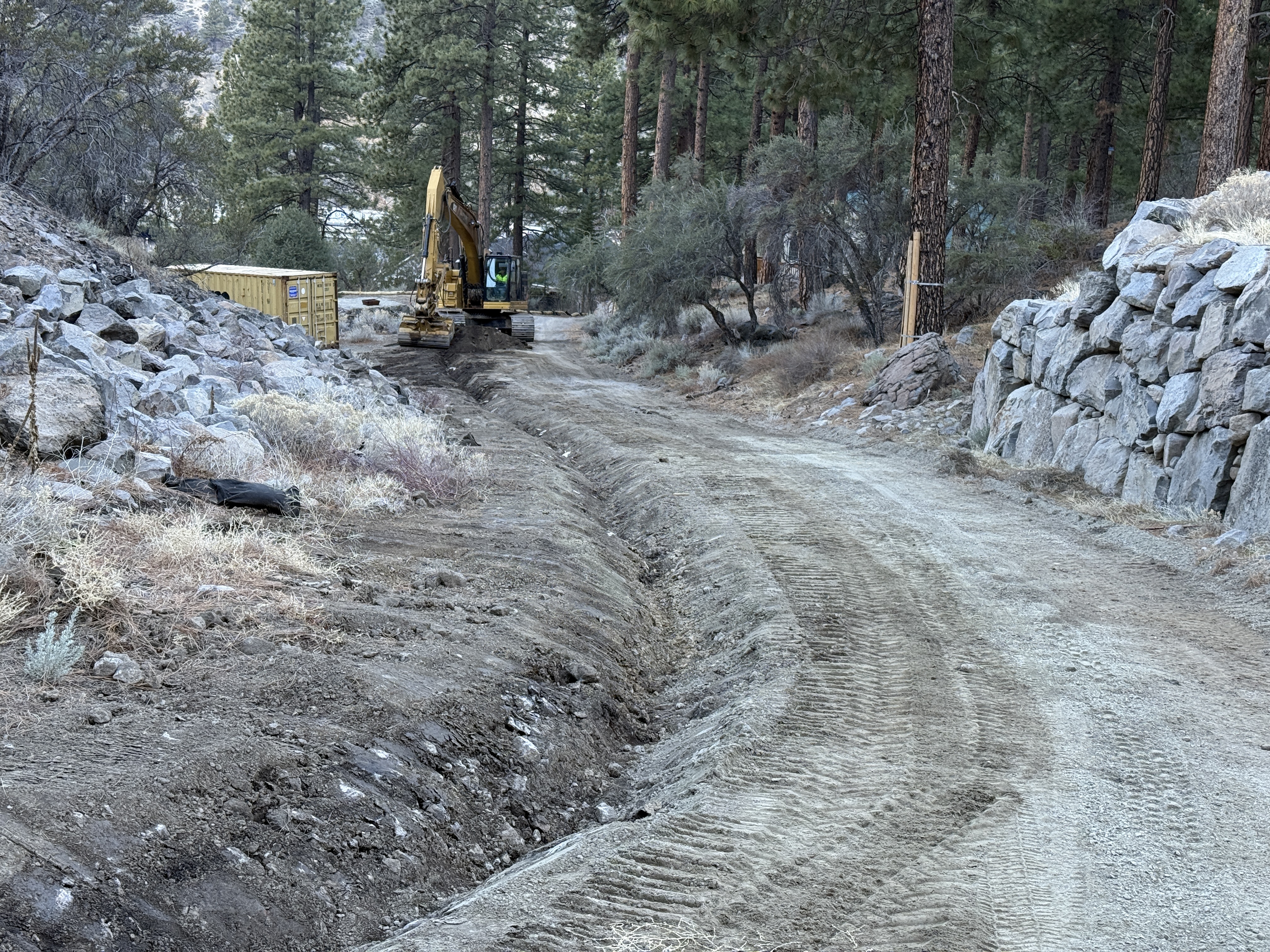 An excavator is positioned on a dirt access road between rocky embankments, possibly engaged in grading. A yellow container is visible in the background. The road shows clear tire tracks, and the environment is surrounded by trees. The work appears to involve shaping or modifying the access path.