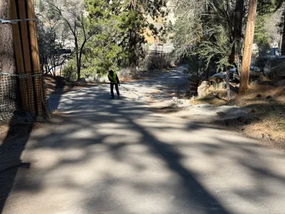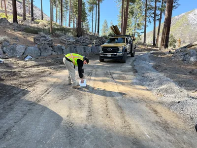 A dirt access road is seen with freshly laid gravel along one side. Tire tracks are visible, indicating recent vehicular activity. Trees and a snow-capped mountain are in the background, suggesting a natural setting. A wooden structure and rocks are on the left side, possibly indicating erosion control or road edging.