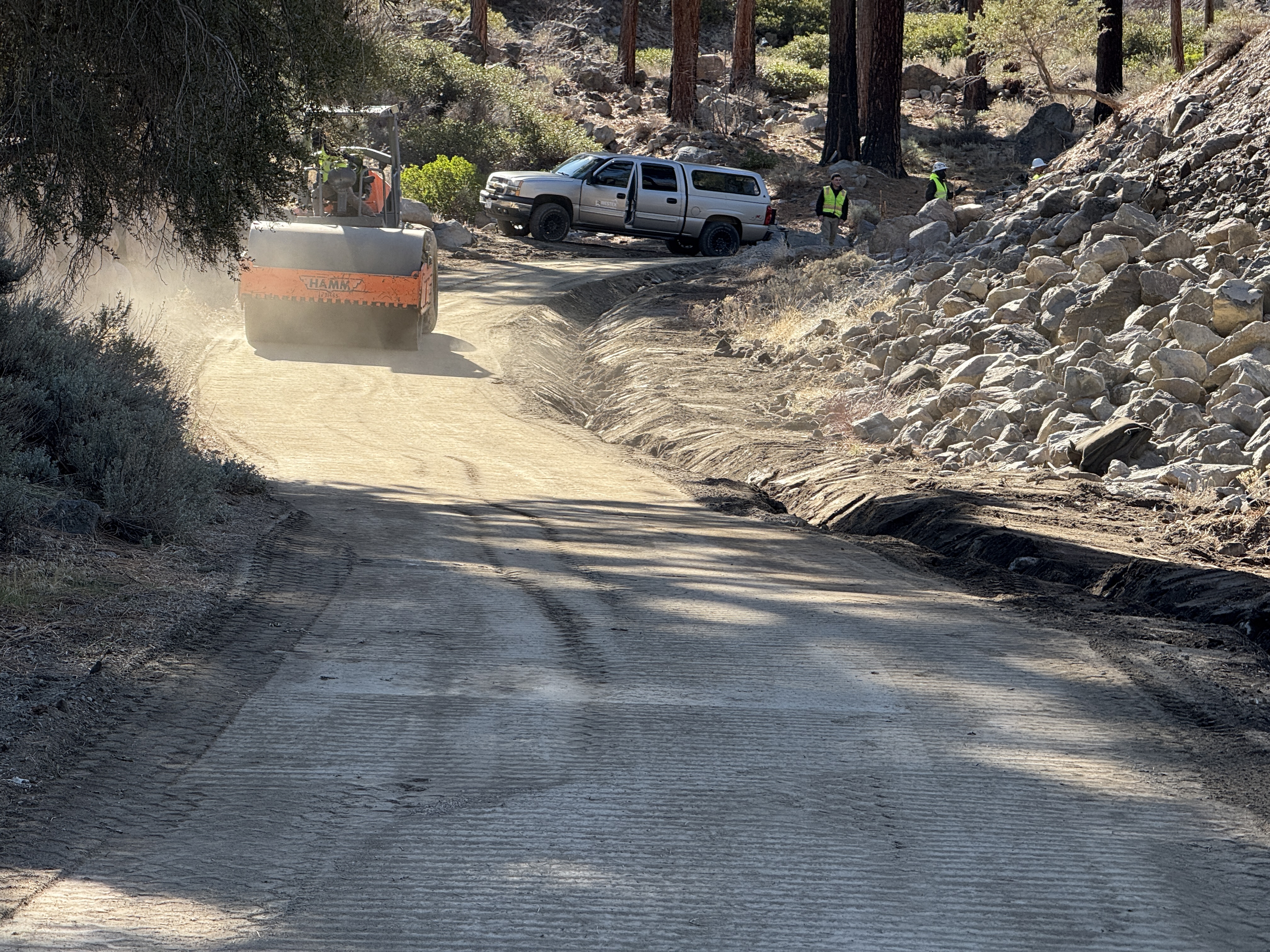 The image shows a soil compaction activity using a roller machine on an access road. A pickup truck is parked in the background with several workers wearing hard hats and hi-vis vests nearby. The scene is set in a wooded area with visible rocks along the roadside. The surface is being compacted likely for improving access road conditions.