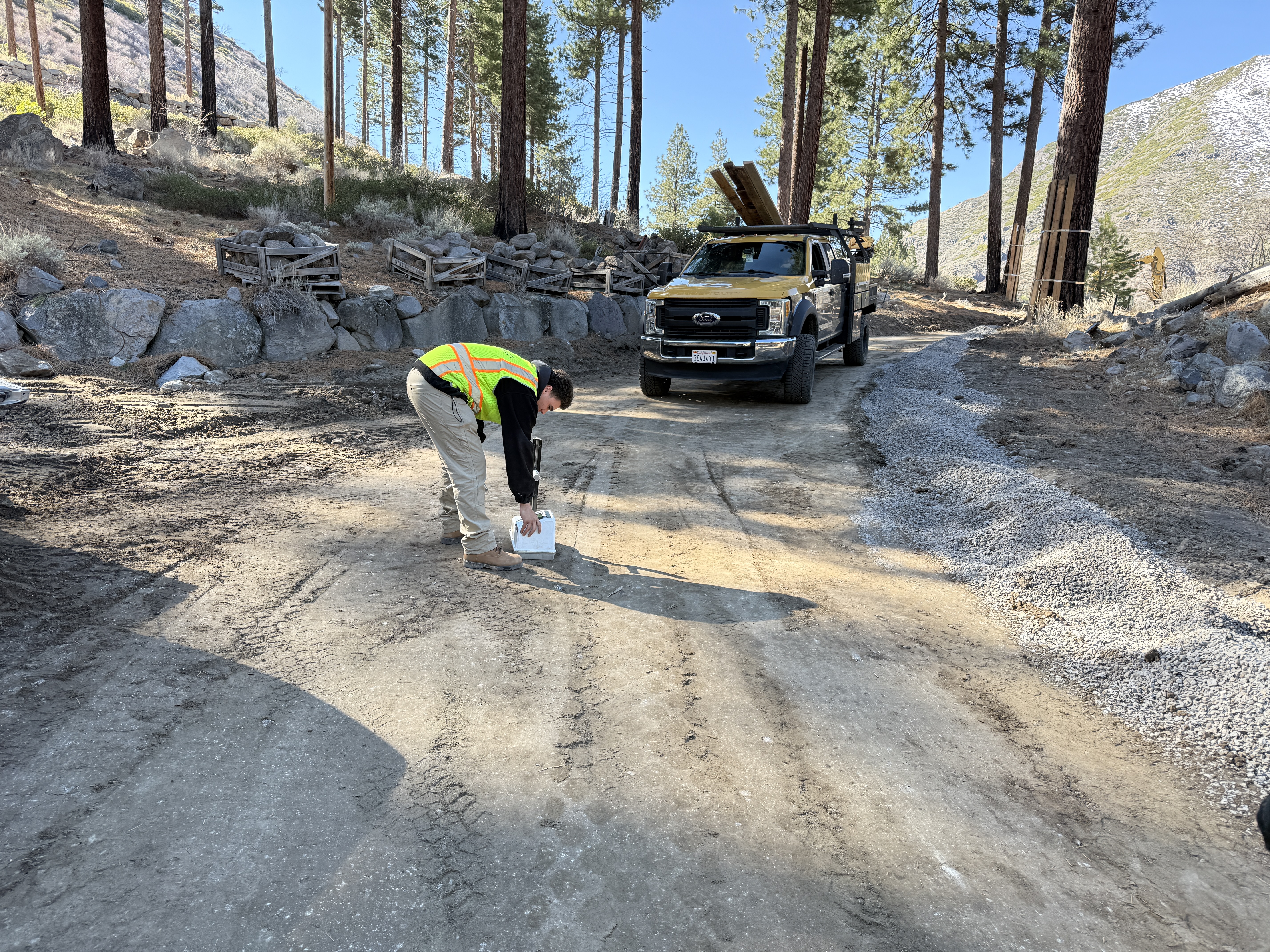 A worker is bending down on an access road possibly conducting an inspection or measurement, with a truck parked nearby. The area is surrounded by trees, and there are stacked construction materials, including rocks and gravel along the roadside. The worker is wearing a high-visibility vest and work boots. There is clear weather with adequate daylight.